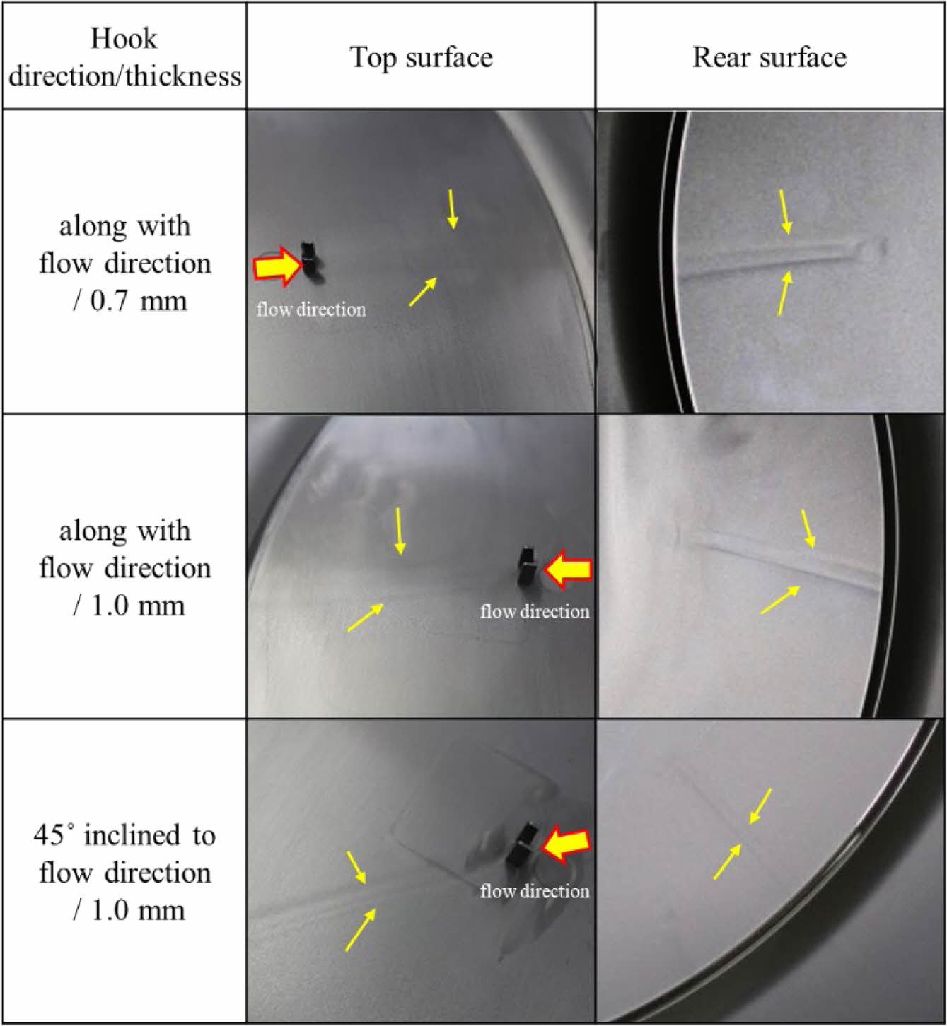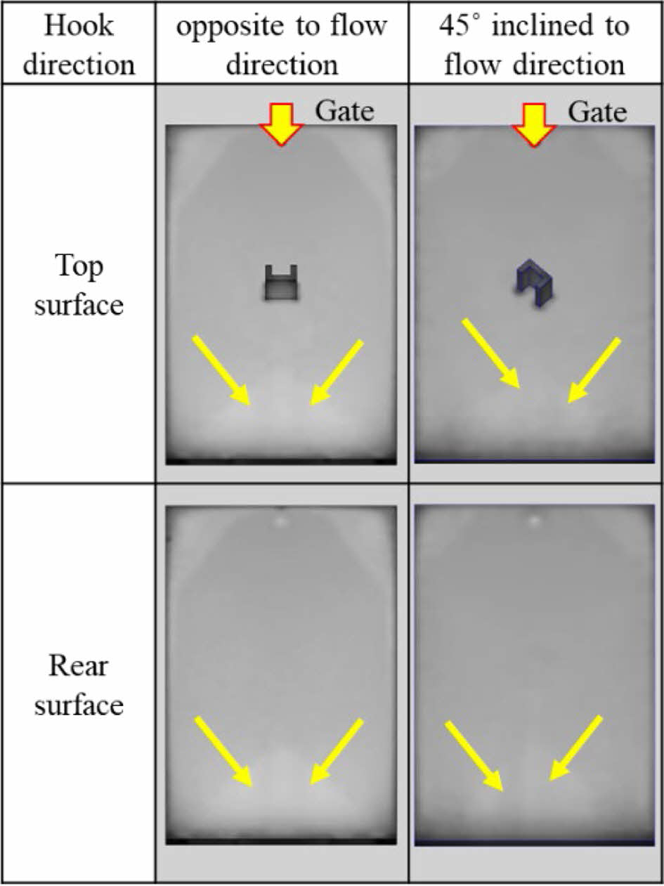 후크에서의 배향: Figure 13는 후크 꺾임 부분의 방향과 후크의 두께에 따른 외관을 보여준다. 후크의 꺾임 부분이 흐름 방향으로 설계된 경우 꺾임 부분을 따라 두 갈래의 얼룩이 나타난다. 후크의 두께가 0.7 mm인 경우 얼룩의 폭이 넓고 깊이는 얕게 나타나지만 후크 두께가 1.0 mm일 때는 얼룩의 폭이 좁고 깊이가 깊어 표면 불량이 뚜렷하다. 후크를 지나며 발생하는 얼룩은 후크 면보다 후크 반대면에서 더 뚜렷하게 나타난다. 후크의 두께가 1.0 mm로 동일할 때, 수지 흐름과 45o 방향인 후크 뒤에서 나타나는 얼룩이 흐름 방향의 후크보다 더 흐릿하게 나타났다.
