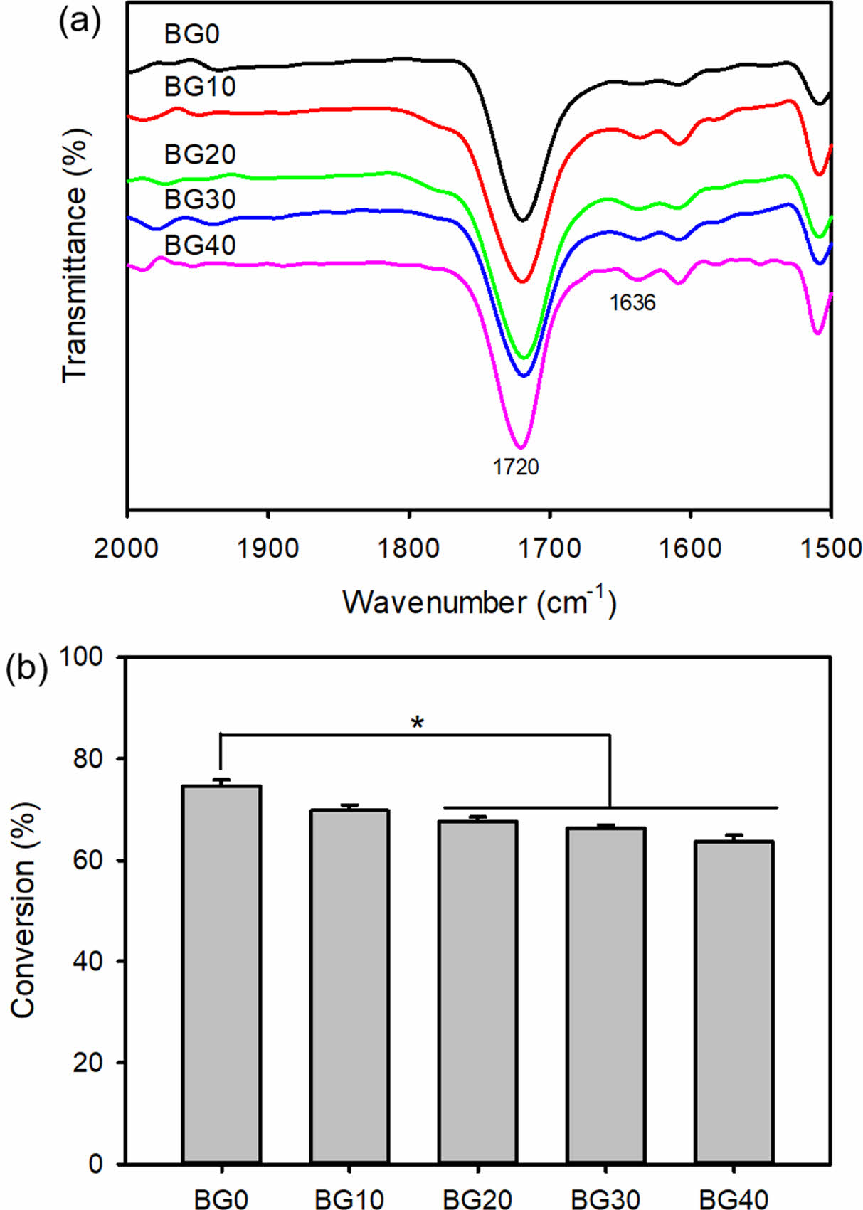 유무기 복합 임시치아의 기계적 강도를 향상시키기 위해서는 무기물인 Ba-glass 입자의 사용량과 유기물인 레진의 중합전환율이 매우 중요한 변수로 작용하게 된다.20,21 따라서 유무기 복합 임시치아의 제조를 위한 최적의 무기물 사용량을 알아보기 위해서 Ba-glass 사용량에 따른 유무기 복합 임시치아에서 레진고분자의 중합전환율을 ATR-FTIR 스펙트럼 변화를 이용하여 계산하였다(Figure 5(a)). 즉 광중합 반응 이후에도 변화하지 않는 1720 cm-1의 C=O 흡수 피크와 광중합 반응 이후 줄어드는 1636 cm-1의 C=C 이중결합 흡수 피크를 이용하였고, 자외선을 조사하지 않은 단량체와 자외선 조사 이후에 고분자로 전환되는 중합전환율을 식 (1)을 이용하여 계산하였다. 임시치아에서 C=C 이중결합이 감소할수록 이에 기인하는 ATR-FTIR 흡수 피크의 면적이 감소하게 되고 결과적으로 중합전환율과도 직접적으로 비례하게 된다. 따라서 자외선 조사에 의해 변하지 않는 C=O 피크의 면적과 자외선 조사에 의해 변하는 C=C 피크의 면적비로 계산할 수 있다.22,23