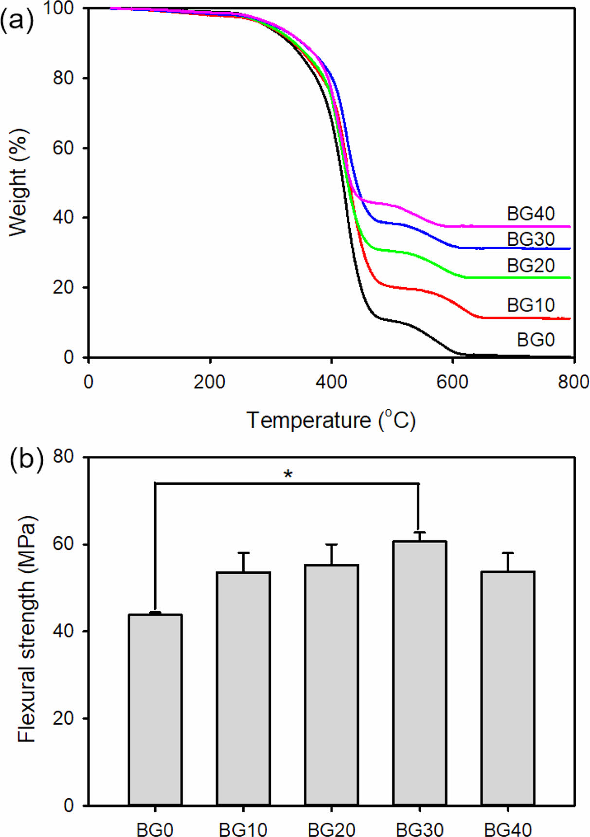 Figure 6 (a) TGA curves; (b) flexural strengths of composite temporary crowns containing different contents of Ba-glass particles. |