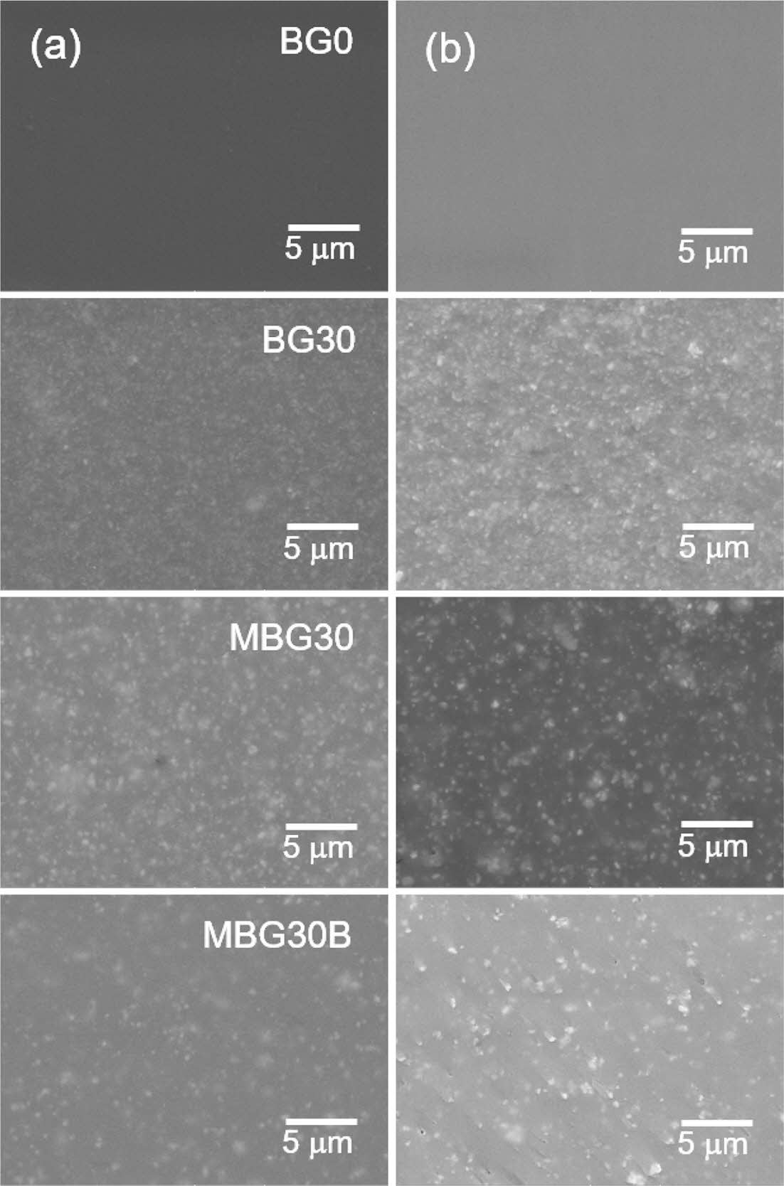 MPS Ba-glass 입자 함유 유무기 복합 임시치아 제조 및 특성 분석. Ba-glass 입자의 액상 레진 단량체와의 상용성을 개선하고 자외선 및 열에 의한 공유결합 반응성을 부여하기 위해서 Ba-glass 입자 표면에 메타크릴기를 도입하여 표면 개질된 MPS Ba-glass를 합성하였고, 이들 입자를 이중경화 시스템을 이용한 유무기 복합 임시치아의 제조에 사용하였다. 표면 개질된 MPS Ba-glass 입자를 액상 레진 단량체 혼합액 무게 대비 30 wt% 사용하고 자외선 조사에 의한 광경화로 제조한 유무기 복합 임시치아를 MBG30이라 명명하고, 자외선 및 열을 이용한 이중경화 시스템으로 제조한 유무기 복합 임시치아를 MBG30B로 명명하였다. 제조된 유무기 복합 임시치아의 표면과 단면의 형상을 SEM을 이용하여 관찰한 결과 Figure 7에서 볼 수 있는 것처럼 표면 개질되지 않은 Ba-glass를 함유하는 유무기 복합 임시치아와 표면 개질된 MPS Ba-glass 입자를 함유하는 유무기 복합 임시치아는 입자의 도입에 따라 표면과 단면이 거친 형상을 보이나 입자의 종류에 따른 표면과 단면의 거칠기 차이는 관찰되지 않았다. 또한 경화법을 변경하여도 표면 및 단면의 형상에는 거의 변화가 없다는 것이 확인되었다.