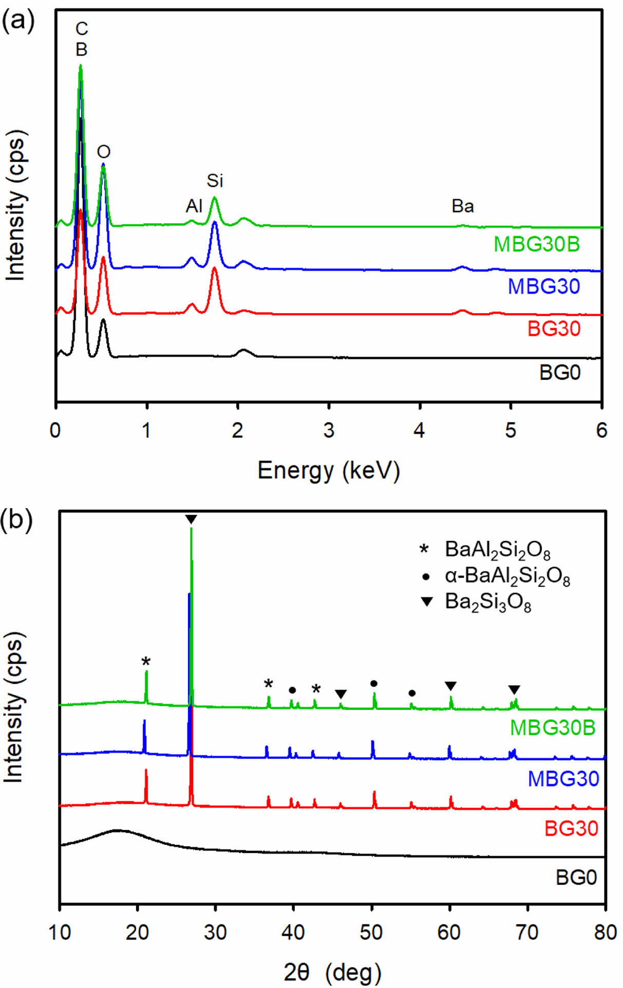 표면 개질된 MPS Ba-glass 입자의 사용에 따른 유무기 복합 임시치아의 표면 원소조성 변화를 EDX를 이용하여 분석하였다. 그 결과 무기물인 Ba-glass 입자를 전혀 함유하지 않은 임시치아인 BG0의 경우 유기물인 레진 고분자의 탄소(C)와 산소(O)에 기인하는 피크가 관찰되었으나 Ba-glass 또는 MPS Ba-glass 입자를 사용한 임시치아에서는 이들 무기물 입자의 사용에 따른 알루미늄(Al), 실리콘(Si) 및 바륨(Ba)에 기인하는 피크가 새로이 관찰되었고 보론(B)에 기인하는 피크는 탄소 피크와 중첩되어 나타났다(Figure 8(a)). 그러나 Ba-glass 입자의 표면 개질에 사용된 MPS의 경우 탄소, 산소, 실리콘 및 수소 원소 만을 가지고 있으므로 입자의 표면 개질 유무에 따른 피크의 변화는 관찰되지 않았다.