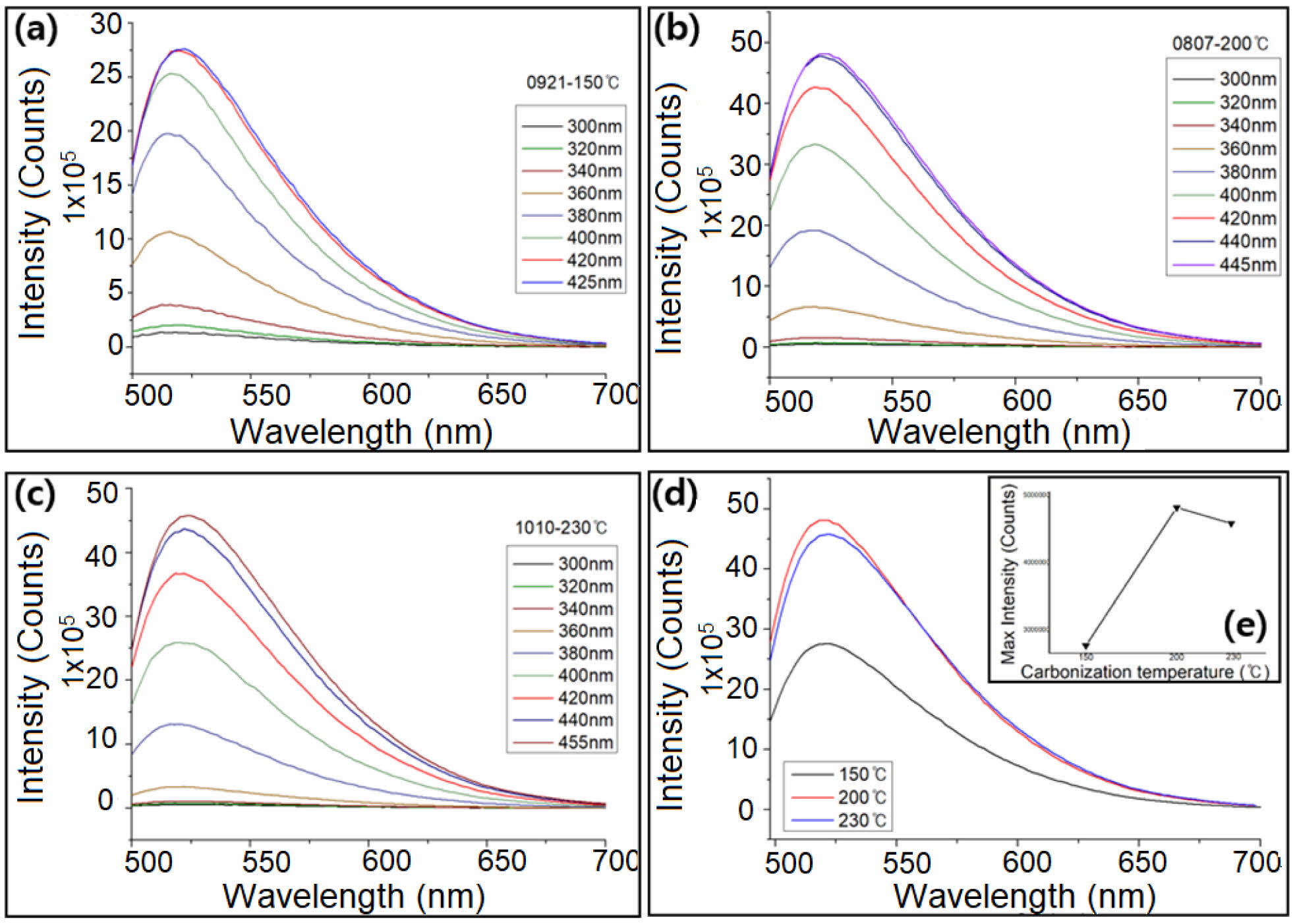 The defining characteristic of QD is their PL activity, which is dependent on emission wavelength and size. From both necessary and applied perspectives, photoluminescence is one of the most intriguing properties of QDs. The produced carbon dots in aqueous solution exhibit green luminescence when exposed to UV light, as illustrated in the insert of Figure 2(b). The PL spectra of the carbon dots (Figure 3(a-c)) indicate that the PL intensity is depending upon the various temperature treated QD. The intensity of the photoluminescence spectra markedly upturns as the various conditions prepared QDs diminishes.34 A significant presence of polar functionality facilitates agglomeration at elevated temperature treatments. The photoluminescence spectra of QD with varying excitation at 510 nm wavelength presented in Figure 3(d). A pronounced photoluminescence emission peaks were displaced to a longer wavelength with the elevation of the denoted wavelength, as evidently illustrated.