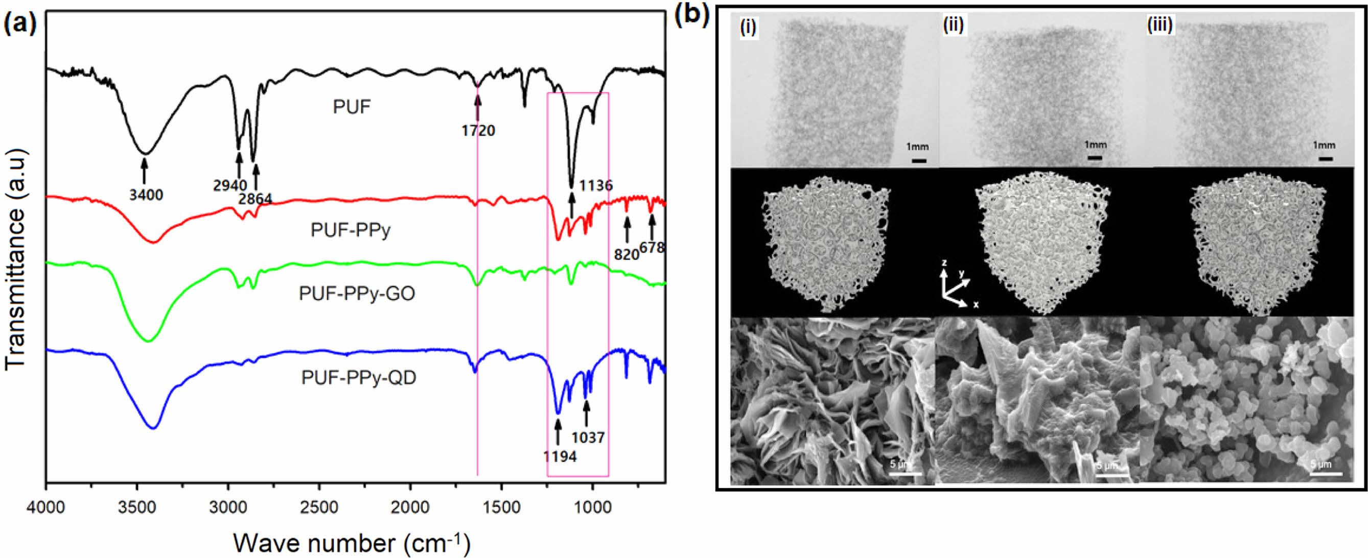 Figure 5 (a) FTIR spectra of prepared hydrophilic nitrogen-doped carbon QD with various synthesis temperatures; (b) micro-CT zoom-in images and SEM images of various PUF-based composite. (i) PUF-PPy, (ii) PUF-PPy-GO, (iii) PUF-PPy-QD, cross-sectional images (up panel) and 3D modeling images (middle panel) and surface SEM images with × 10,000 magnifications. |