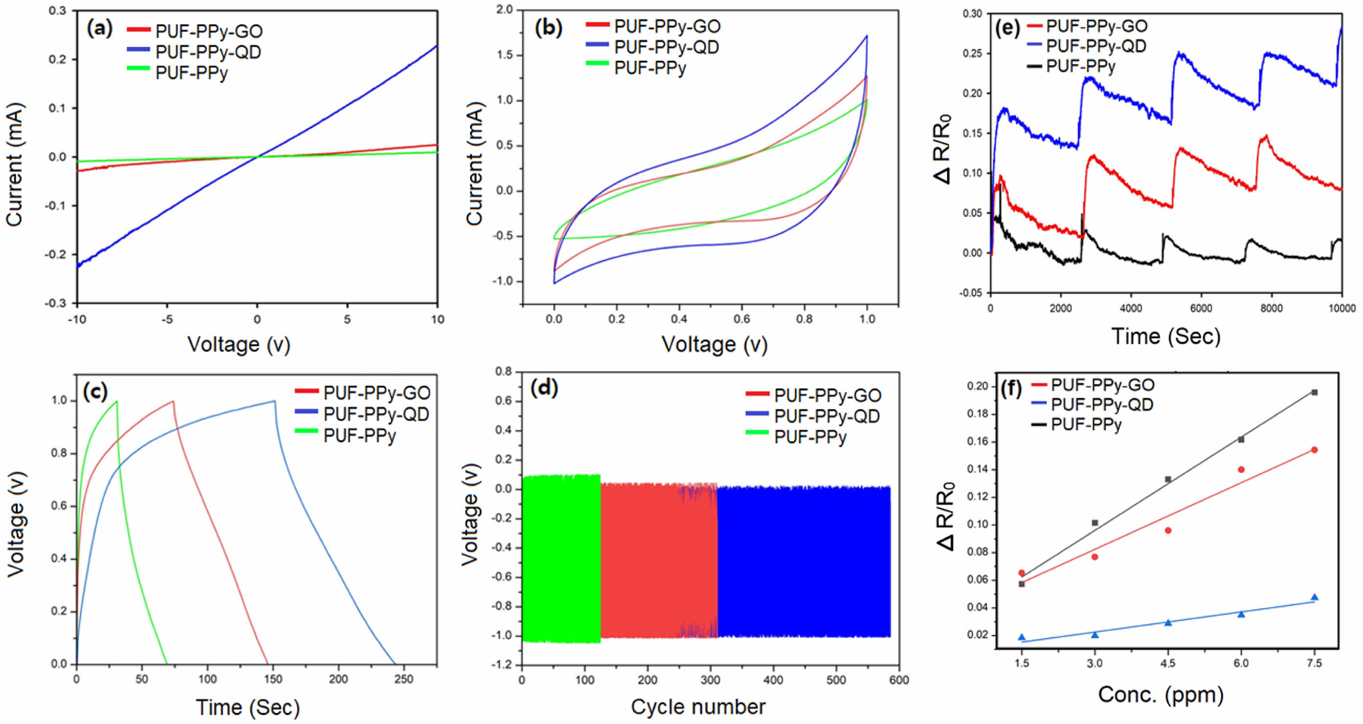 Figure 6 Electrochemical analysis of various PUF based composites: (a) I−V curve; (b) CV curve; (c) galvanostatic charge−discharge profile; (d) stability for various PUF composites prepared with different fabrication processes; (e) behaviors of gas sensors for repeatability of detection response of different PUF composites at 7.5 ppm; (f) sensitivity as a function of ammonia concentration. |