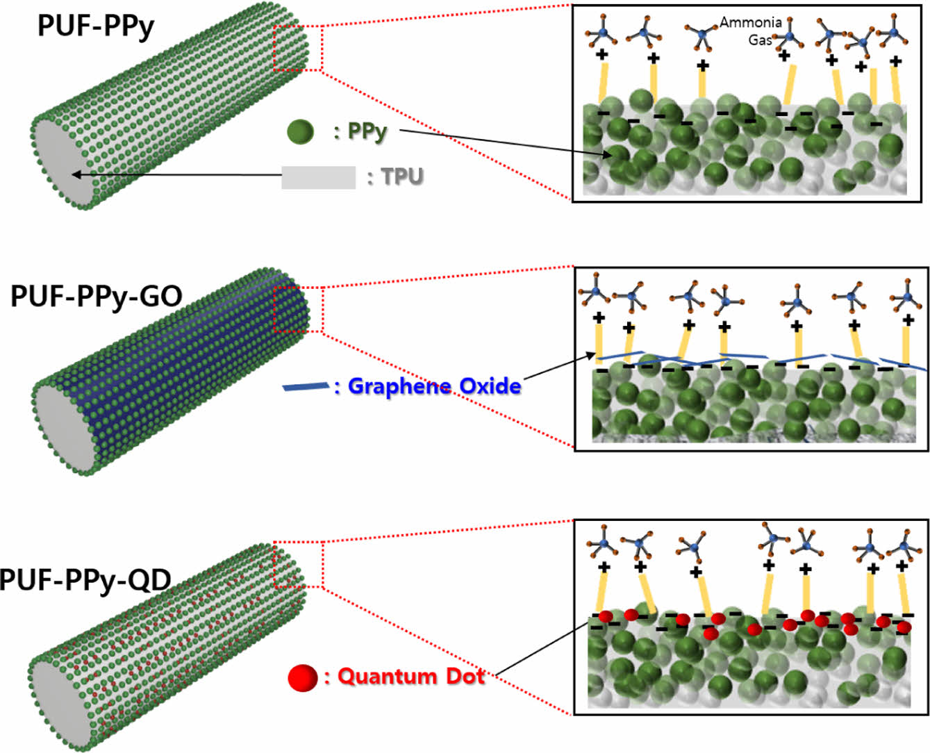 Figure 7 elucidates the gas detecting principle of the constructed electrode. The intricate architecture of PPy, QD and GO facilitates the adsorption of ammonia gas molecules. The conductivity related to carrier concentration of the PPy main chain was influenced by the "electronic sensitization" between QD and GO and NH3 gas molecules.