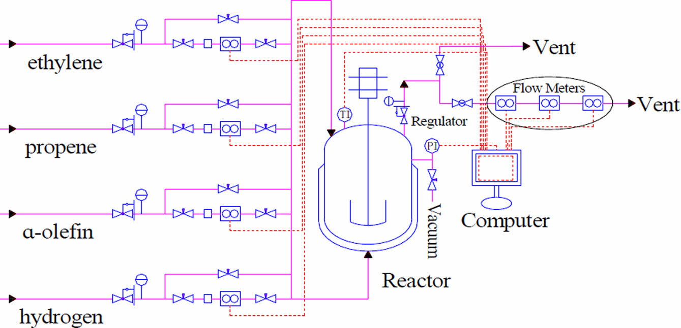 As shown in Figure 1, gas intake lines are equipped with Swagelok reduction valves and thermal mass flow controllers (Brooks Instruments, SLA5850). Ethylene and propene flow controllers are calibrated with nitrogen and the standard pressure and temperature are selected at 1 atm and 20 ℃. Hydrogen flow controller is calibrated with hydrogen and the standard pressure and temperature are selected at 1 atm and 0 ℃. The three lines converge at one point and are connected to the top and bottom of the reactor. The top of the reactor is connected with a vent line, which is connected in series with a Swagelok reduction valve, a Coriolis mass flowmeter (Brooks Instruments, Quantim), a thermal mass flowmeter (Brooks Instruments, SLA5800) and a differential pressure flowmeter (Alicat Scientific, Alicat MC). The Coriolis flowmeter is calibrated with air. The thermal flowmeter on the vent line is calibrated with ethylene and the standard pressure and temperature are selected at 1 atm and 0 ℃. The differential pressure flowmeter is calibrated with air and the standard pressure and temperature are selected at 1 atm and 25 ℃. The measurement accuracy of the Coriolis flowmeter, thermal flowmeter and differential pressure flowmeter is ±0.5%, ±0.18% and ±0.4%, respectively. The response time of the Coriolis flowmeter, thermal flowmeter and differential pressure flowmeter is below 0.5 s, 1 s and 0.1 s, respectively. The reactor temperature, pressure, gas feed flow and real-time volume flow readings of the three flow meters on the vent line can be monitored via a computer equipped with a distributed control system (DCS, SUPCON). The temperature and pressure of the exhaust are also monitored because temperature and pressure sensors are embedded in the differential pressure flowmeter.