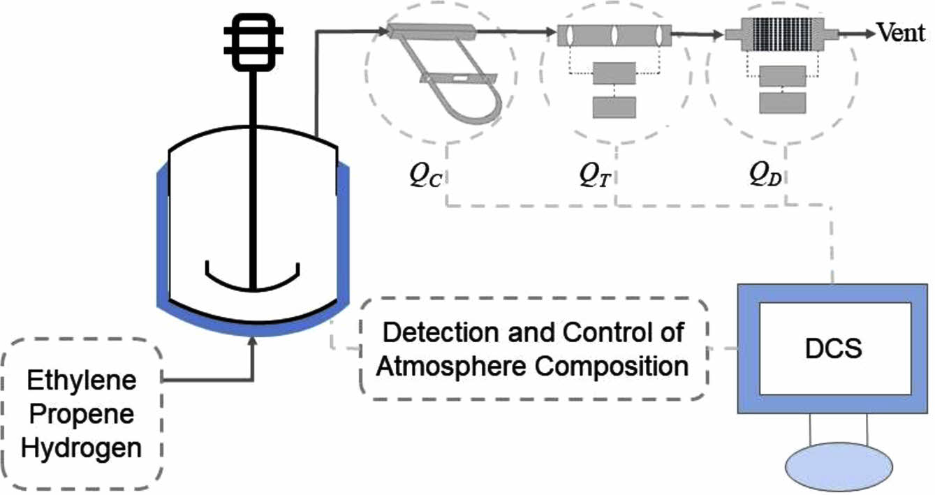 where QC, QT and QD are the volume flow readings of the Coriolis flowmeter, thermal flowmeter and differential pressure flowmeter, yA, yBand yCare the molar fractions of ethylene, propene and hydrogen. And z1= 3.20977, a1= -4.26232, b1= 4.17147, c1= 0.58209, d1= -1.26432, z2= -2.46663, a2= 5.40595, b2= -4.56239, c2= -1.23629, d2= 1.54756. By utilizing the real-time atmosphere composition of the vented exhaust, DCS feedback controlled the flow controllers on the intake lines to feed each gas to ensure that the atmosphere composition in the reactor reached the set value.