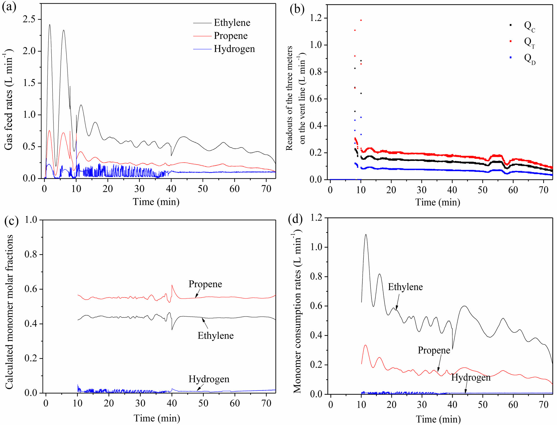 Figure 3(c) shows the atmosphere composition in the reactor during gas-phase copolymerization in run 1, which were calculated from the volume flow readings of the