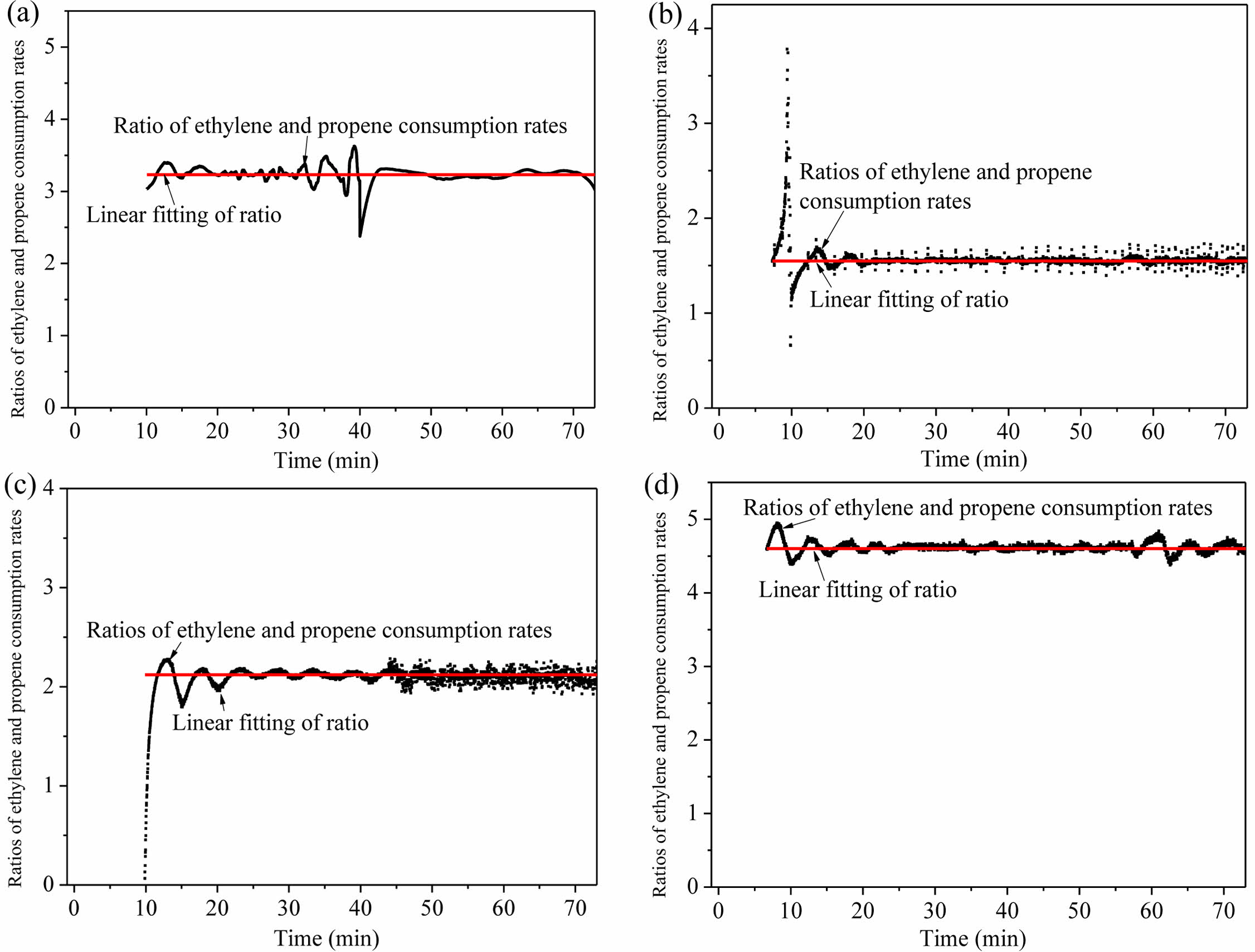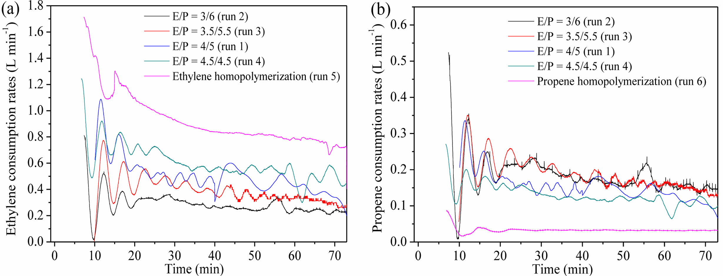 The derived consumption rates of monomers are shown in Figure 3(d). The decay trends of ethylene and propene consumption were similar, and hydrogen consumption was almost zero.