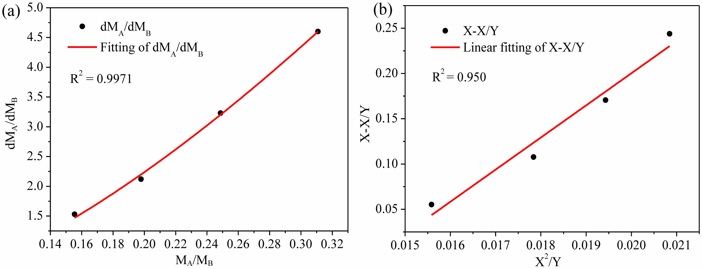 The ratios of monomer consumption rates (dMA/dMB) remained unchanged, their values were determined by linear fitting (Figure 4, Table 5), and then the monomer reactivity ratios were estimated according to Mayo-Lewis equation (Figure 6(a)). Good fitting was obtained and the calculated values with 95% confidence were rA= 42.28 ± 7.15, rB= 0.6452 ± 0.1419 and rArB = 27.28. The reactivity ratios were also evaluated by Fineman-Ross equation:31