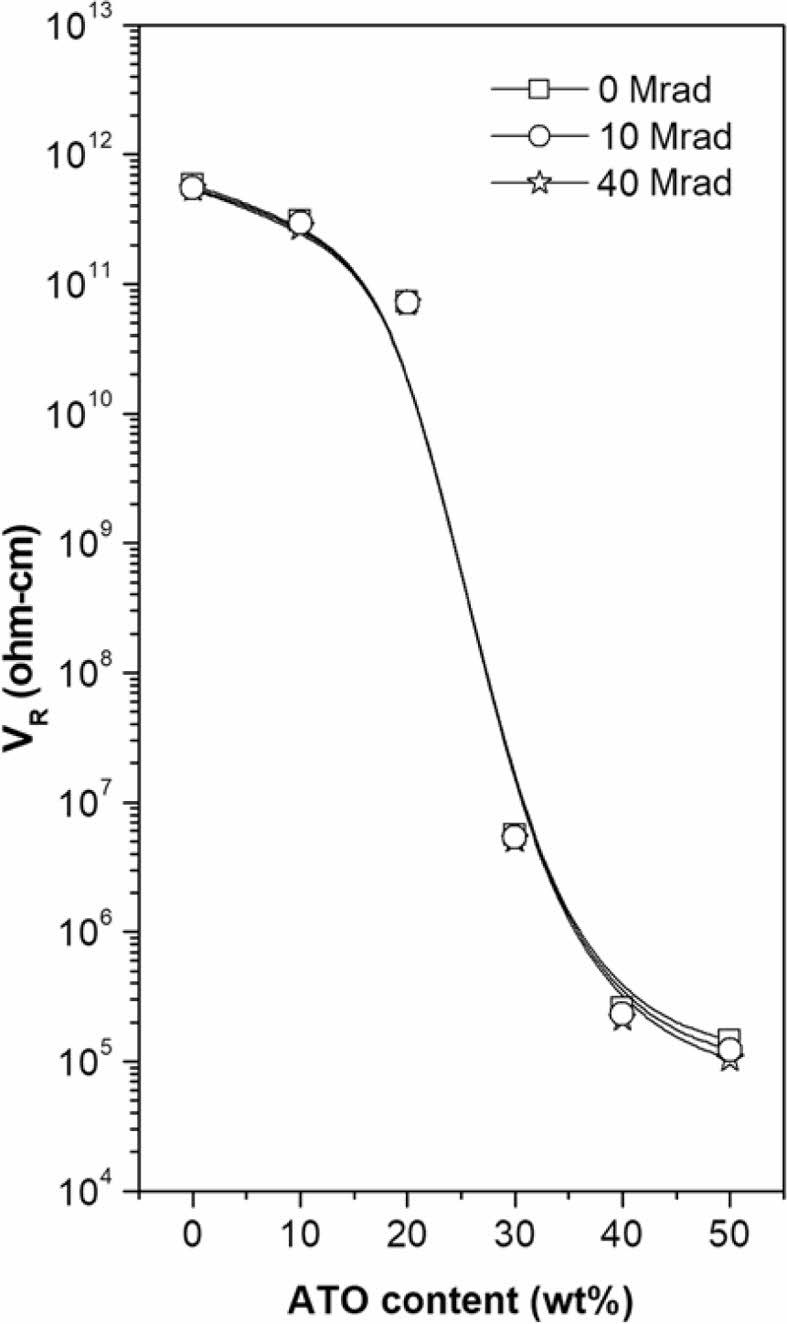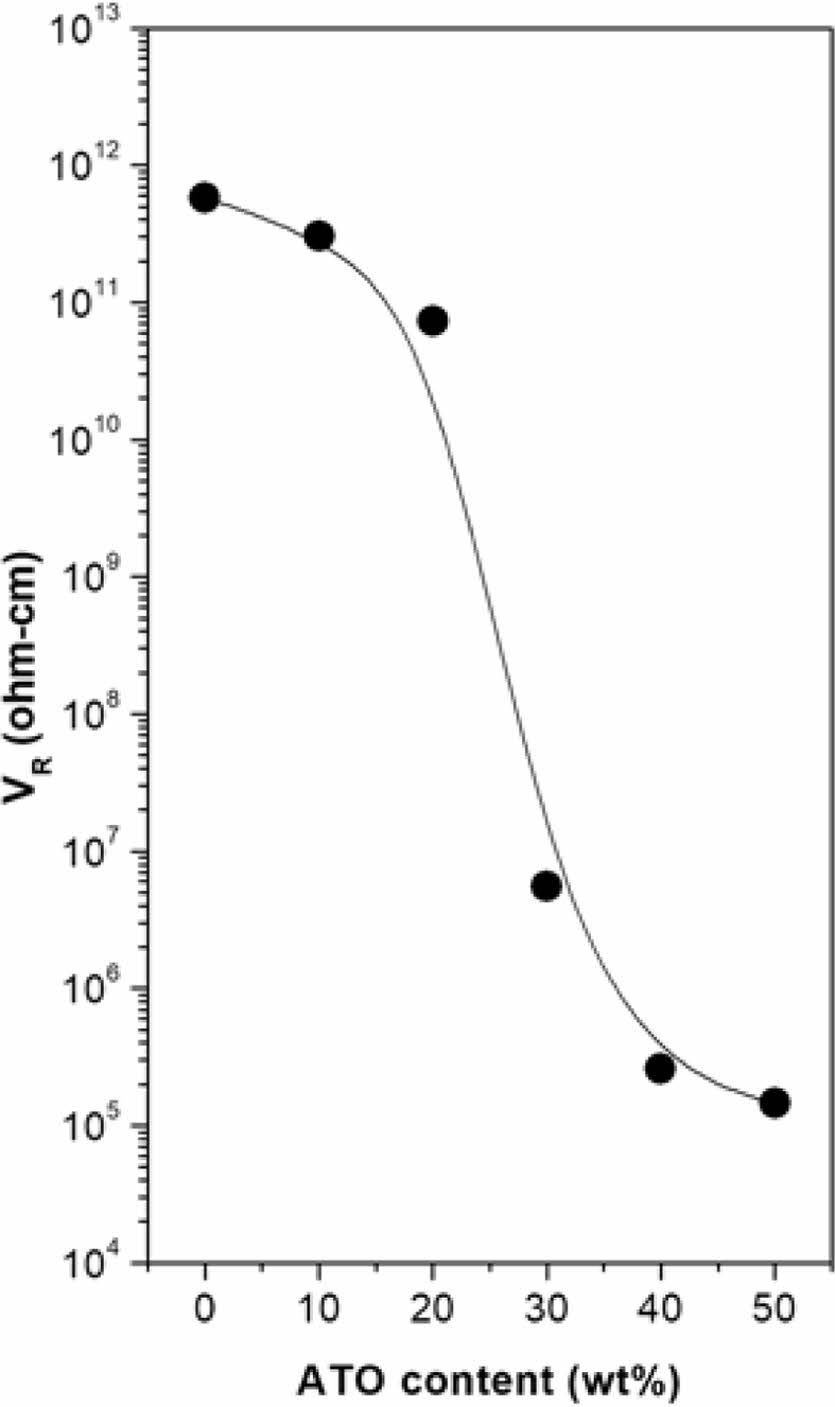 Figure 2 illustrates the dependence of VR on the ATO content in PMP/ATO nanocomposites. The VR decreased significantly with increasing ATO content. When the concentration of electro-conductive particles exceeds the percolation threshold, these particles form a continuous conductive path within the material, enabling electron flow.12 The percolation threshold for PMP/ATO nanocomposites was estimated to be approximately 25 wt%.