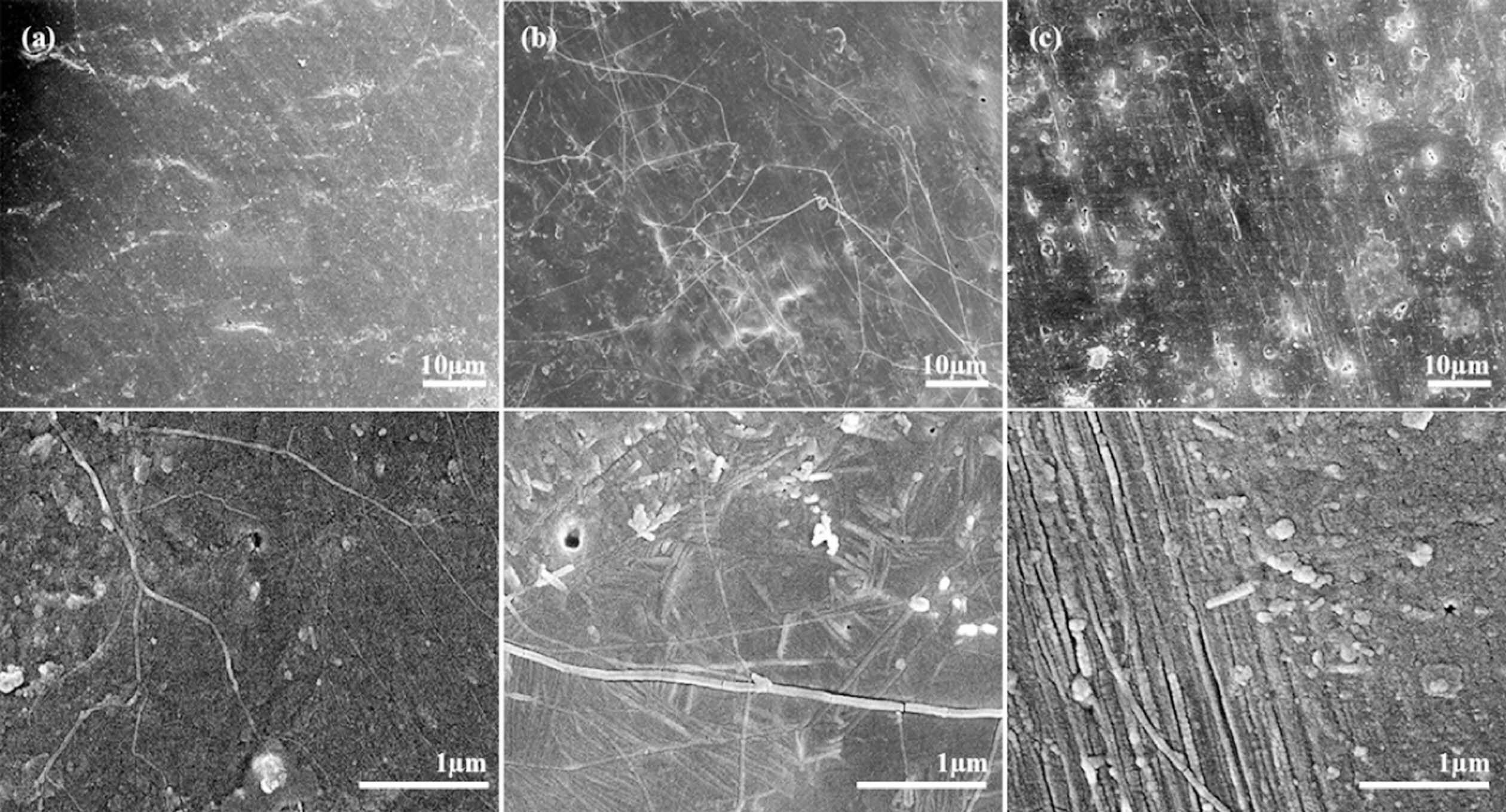 The compositions of PMP/ATO20 wt% and PMP/ATO40 wt% were below and above the percolation threshold, respectively. In the nanocomposite below the percolation threshold (Figure 3(a)), randomly distributed ATO fibers (small white spots) were easily visible, and faint streaks, indicative of potential electrical conductive pathways, began to arrange themselves regularly. As the percolation threshold was reached (Figure 3(b)-top), numerous stripes connected in a canal-like pattern appeared on the tensile fracture surface, indicating that the concentration of ATO fibers was sufficient to maintain conductive pathways.