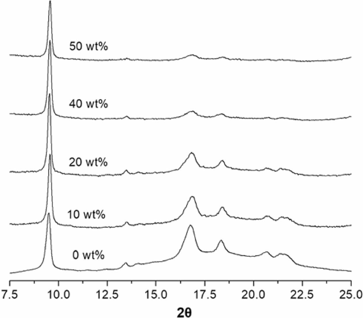 As shown in the XRD pattern of PMP (Figure 4), specific peaks at around 9.5, 13.5, 16.8, 18.4, 20.7, and 21.5° corresponded to the (200), (201), (212), (321), (400), and (203) crystallographic planes of the Form I orthorhombic phase of PMP.13,16 Like other semi-crystalline polyolefins, PMP is polymorphic and has five different crystalline forms. Form I is the most stable form, commonly obtained in melt-crystallized samples.17,18