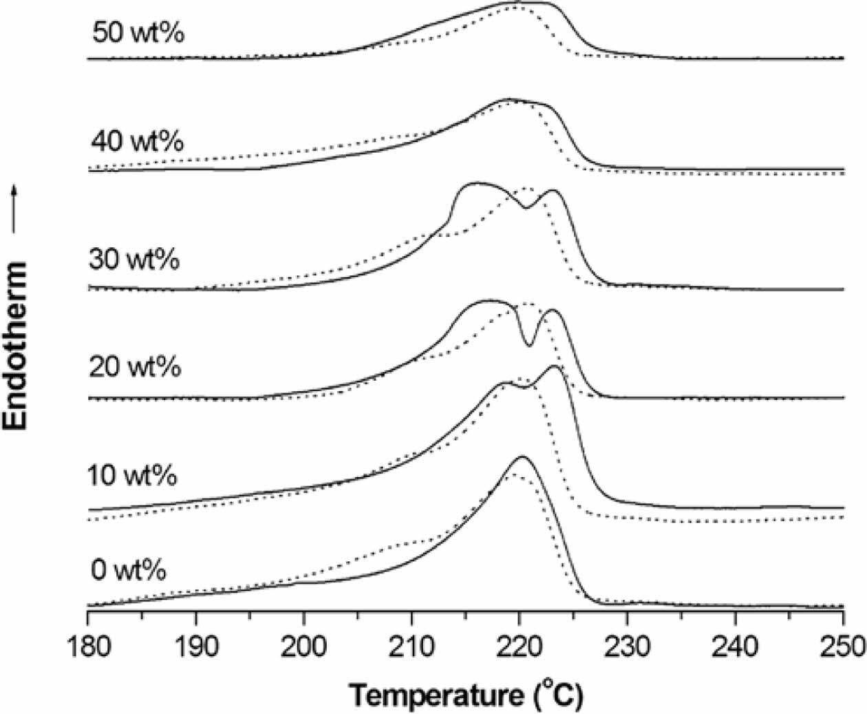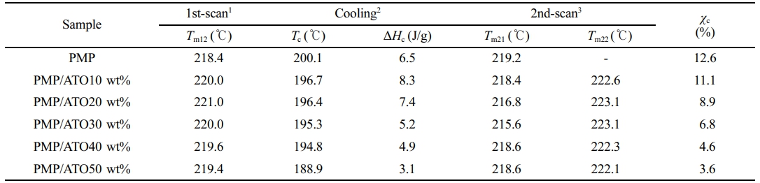 The addition of ATO up to 30 wt% resulted in the splitting of the 2nd-scan DSC melting peak of PMP (originally at 220.2℃) into two peaks: one in the range of 215-219 ℃ and another around 223 ℃. For ATO contents above 40 wt%, the low-temperature peak (Tm21) almost disappeared, leaving a broad peak nearly identical to that of pristine PMP.