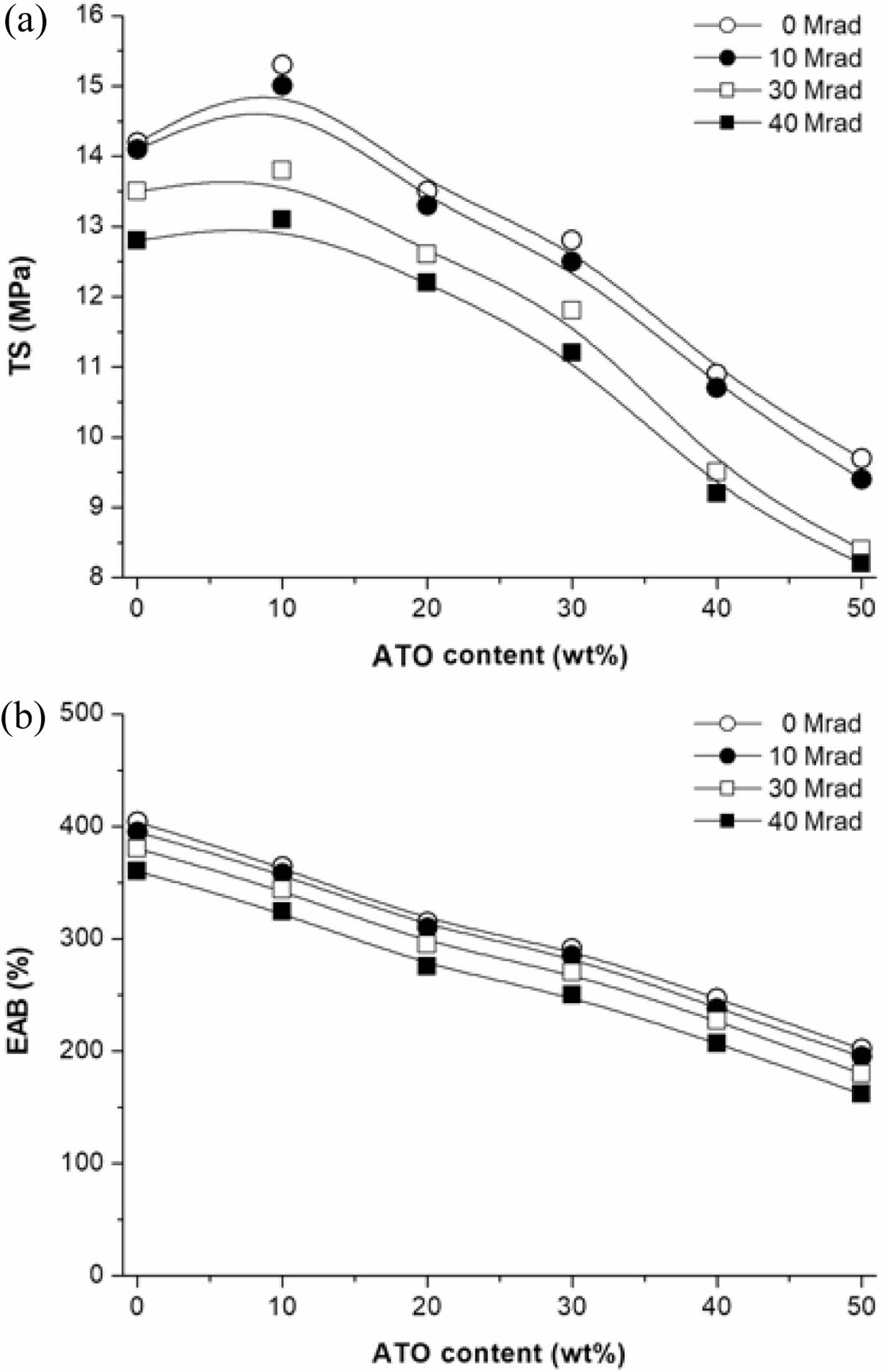 Changes in Physical Properties of PMP/ATO Nanocomposite After EB-irradiation. Figure 8 summarizes the effect of EB-irradiation on the tensile properties of PMP/ATO nanocomposites. It can be seen that TS (Figure 8(a)) and EAB (Figure 8(b)) of EB-irradiated samples gradually decreased upon EB-irradiation. For nanocomposites irradiated with EB at a dose of 10 Mrad, the changes in TS and EAB were small compared to those of pristine PMP. However, at higher doses, the tensile properties were significantly reduced. For PMP/ATO50 wt%-40M, an approximately 15% and 20% decrease in the TS and EAB of 8.2 MPa and 162%, respectively, was observed relative to those of PMP/ATO50 wt%. The decreased tensile properties of the EB-irradiated samples can be attributed to chain-scission induced by EB-irradiation.23