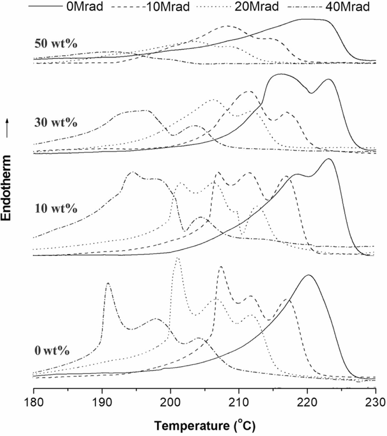 For EB-irradiated PMP, partially cross-linked chains, chain-scission moieties, and almost pure crystals were observed to coexist.23 At 10 wt% ATO content, these three crystal structures were not significantly affected. However, when the ATO content increased above 30 wt%, the crystal formation of the partially cross-linked regions appeared to be limited. The reduced mobility of partially cross-linked polymer chains and the presence of a large number of filler particles might hinder the crystallization of polymer molecules in the melt.