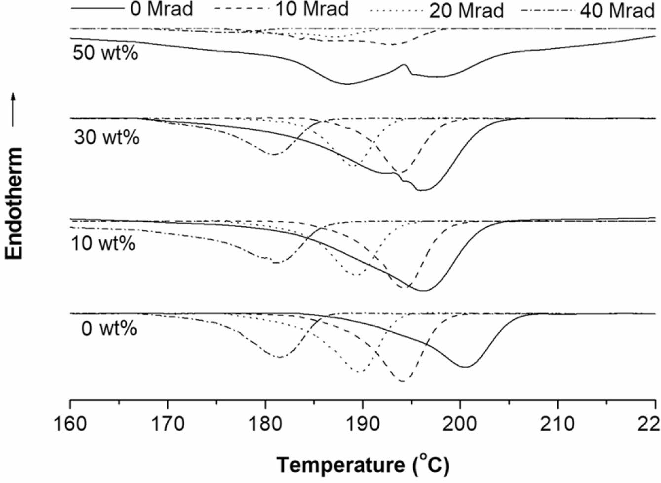 The DSC cooling curves of EB-irradiated PMP and its 10, 30, and 50 wt% ATO-filled PMP nanocomposites are shown in Figure 10. The Tc of the EB-irradiated PMP and PMP/ATO10 wt% tended to decrease as the EB-irradiation dose increased. For example, the Tc of pristine PMP decreased from 200.6 to 181.4 ℃ with increasing EB-irradiation dose. For PMP/ATO30 wt%, it decreases from 196.1 to 180.7 ℃.