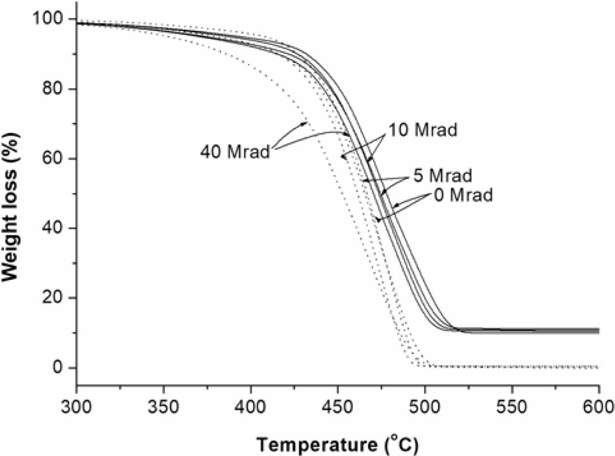 Under EB-irradiation of 10 Mrad or less, the tensile properties and thermal stability of PMP/ATO nanocomposites did not change significantly. However, at higher doses, these properties deteriorated sharply. On the other hand, the VR of all nanocomposites did not change significantly with EB-irradiation dose due to the more stable conductive pathways formed by the partially cross-linked PMP matrix.