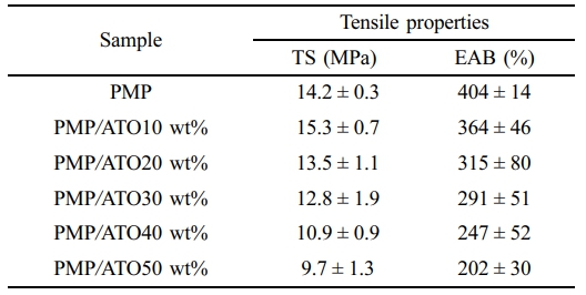 The elongation at break (EAB) of the nanocomposites gradually decreased with increasing ATO content. For PMP/ATO10 wt% and PMP/ATO50 wt%, the EAB was measured as 364% and 202%, respectively, which were 1.1 and 2.0 times lower than that of PMP. This indicates the filler particles impede the chain mobility of the polymer matrix, reducing its ability to deform.13,14