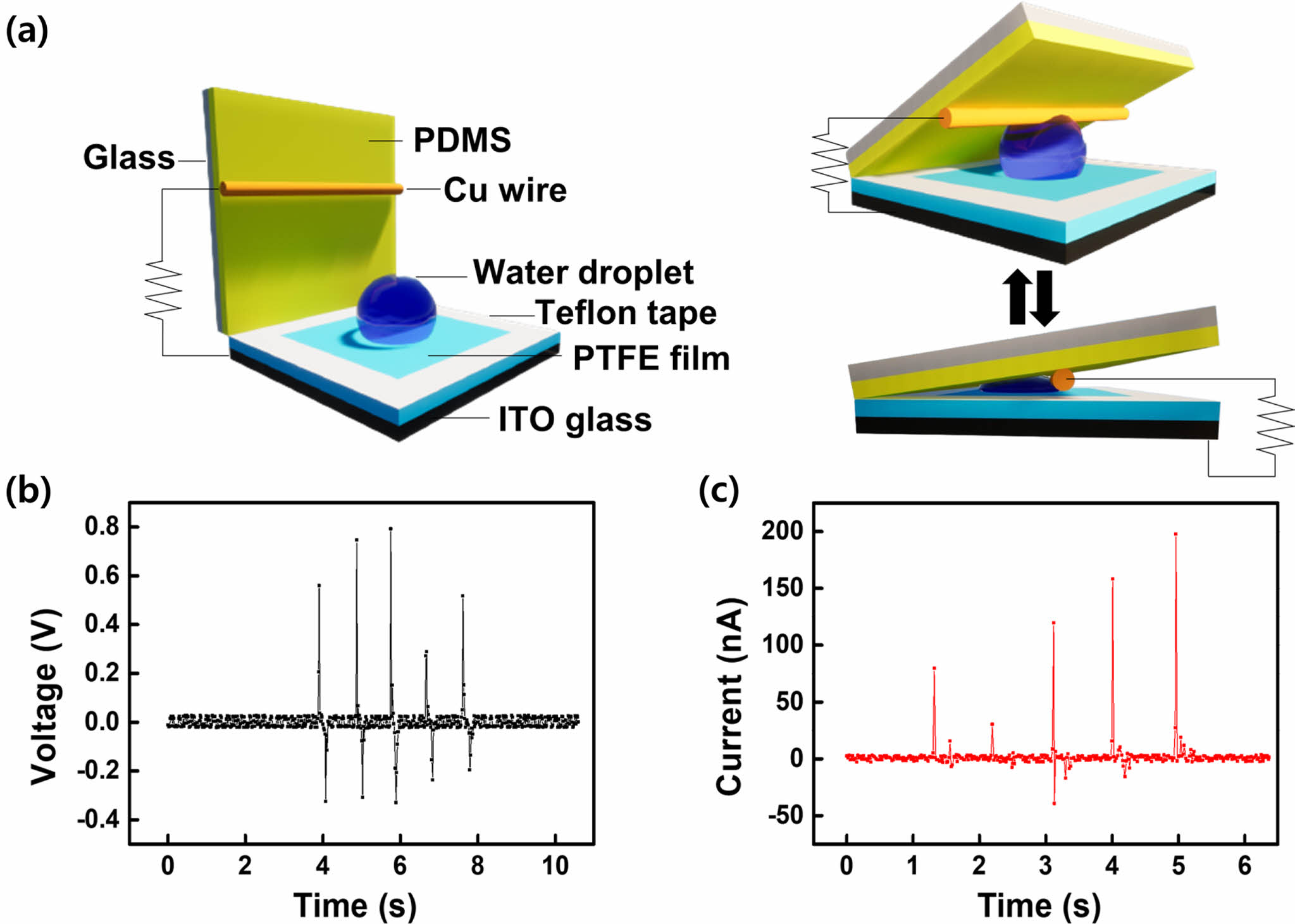 (a) Schematic diagram of the design and working principle of the CS-DEG; (b) voltage; (c) current generated by a 5 μm-thick PTFE film and 20 µL water droplet.