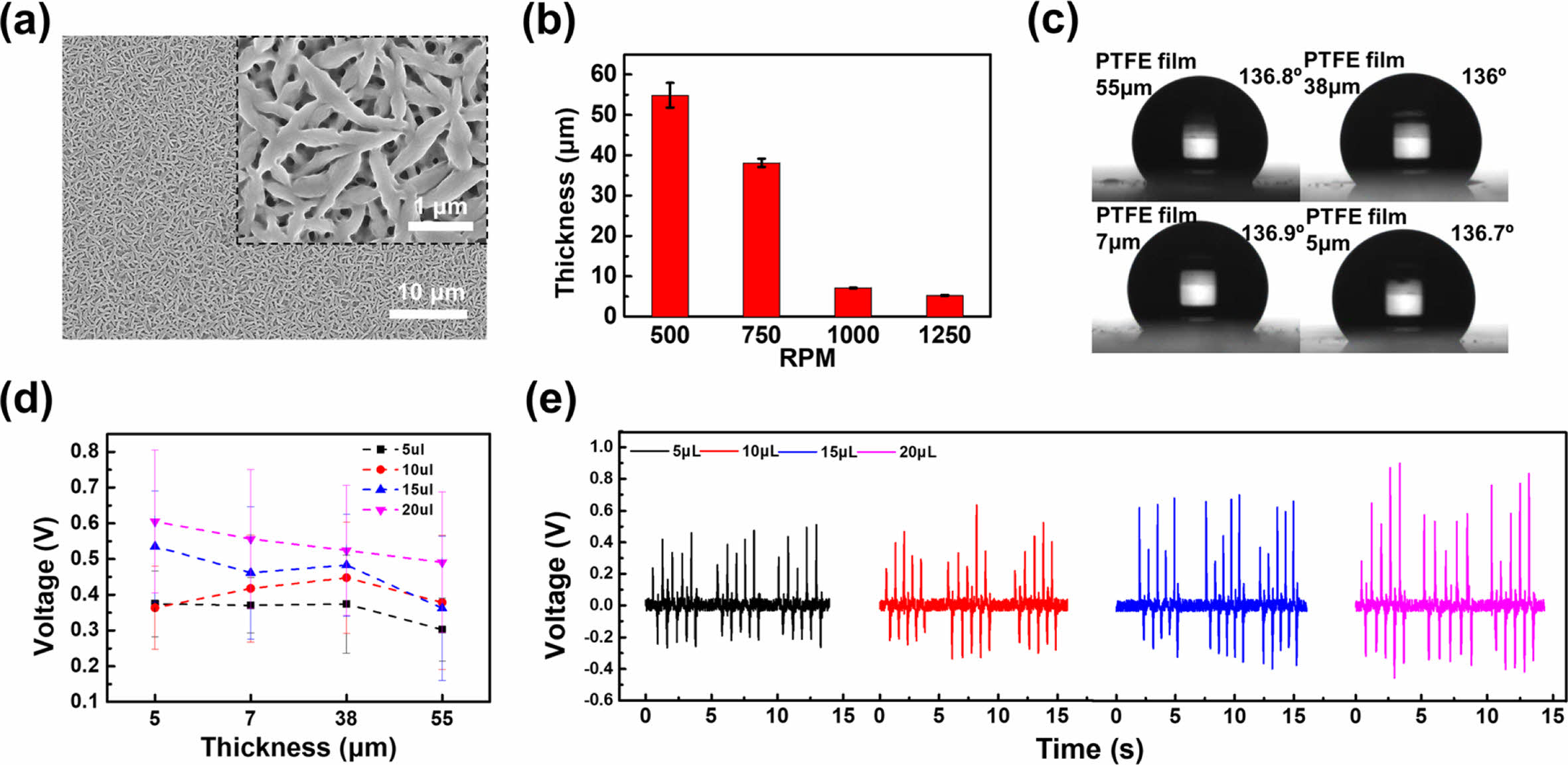 Characterization of the PTFE-coated ITO glass: (a) FE-SEM images of the surface of a 5 μm-thick PTFE film; (b) PTFE thickness as a function of spin-coating speed; (c) contact angle of a 20 µL water droplet as a function of PTFE thickness; (d) voltage generated as a function of PTFE thickness for water droplets of different volumes; (e) voltage generated as a function of droplet size on the surface of a 55 μm-thick PTFE film.