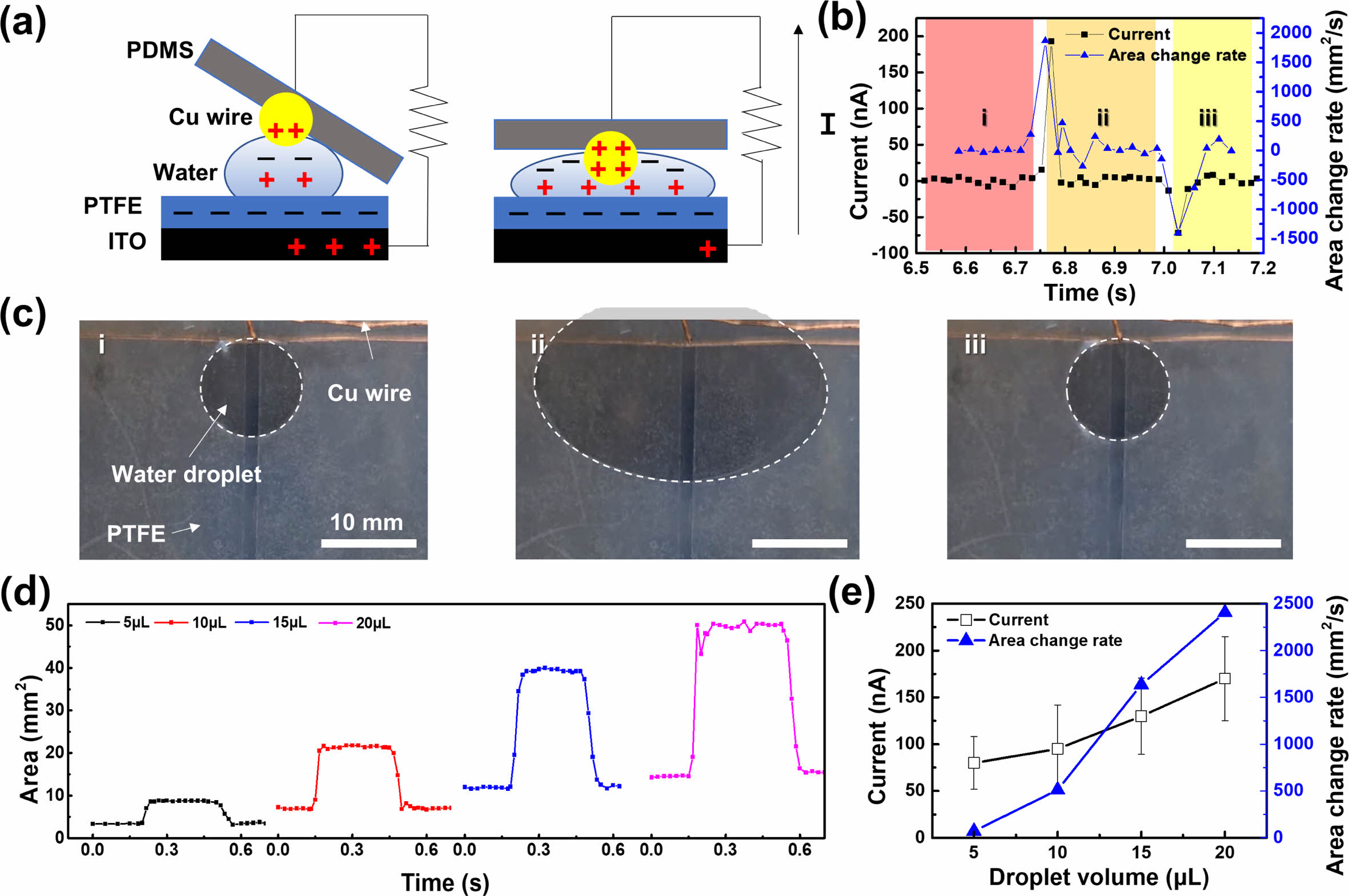 Analysis of the mechanism of the CS-DEG: (a) schematic of the working mechanism of the CS-DEG; (b) measurements of the change in contact area of the water droplets and the resulting current; (c) images of the change in contact area of a water droplet; (d) changes in contact area as a function of water droplet size; (e) correlation between the change in contact area and resulting current as a function of water droplet volume.