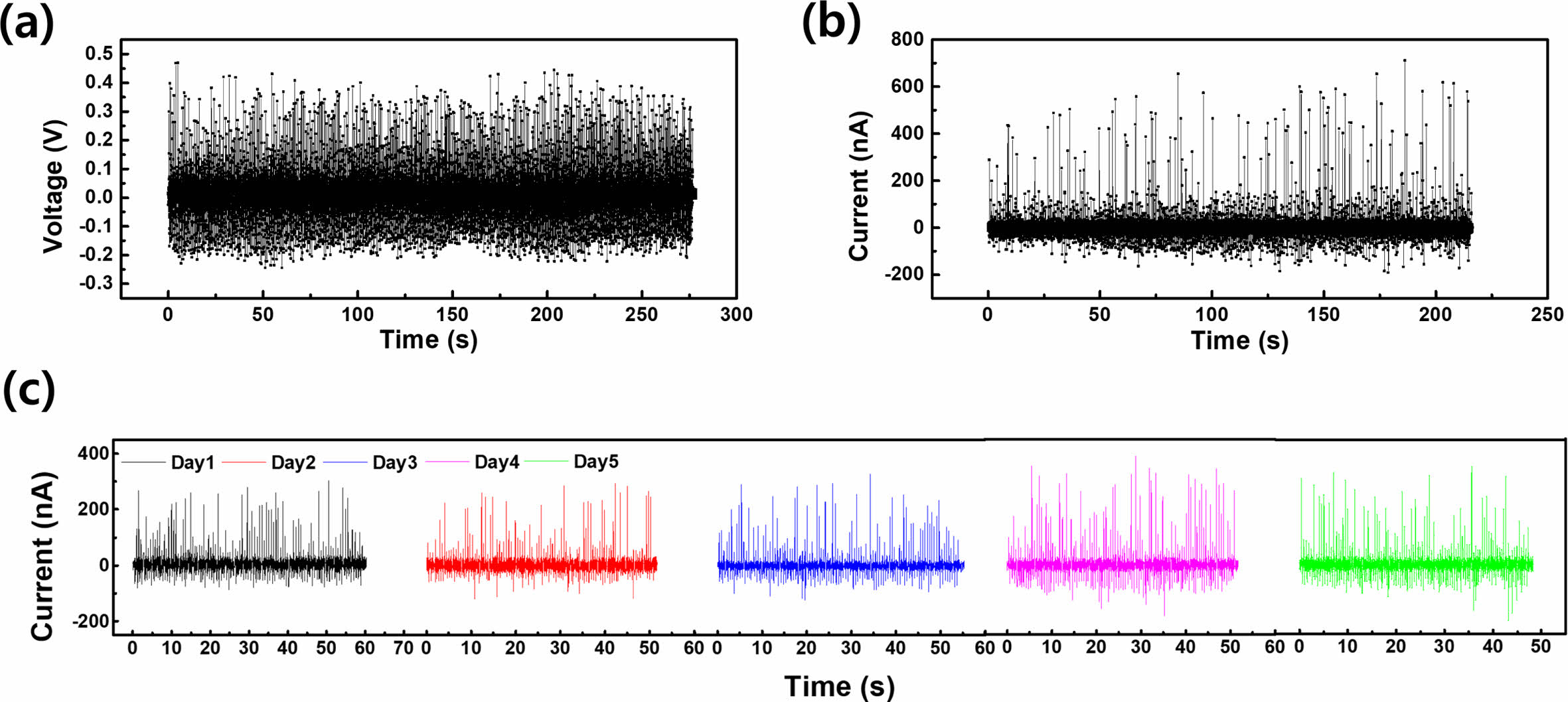 Stability evaluation of the CS-DEG: (a) voltage; (b) current generated with a 20 µL water droplet over 500 cycles; (c) current variation over 5 days at 100 cycles per day
