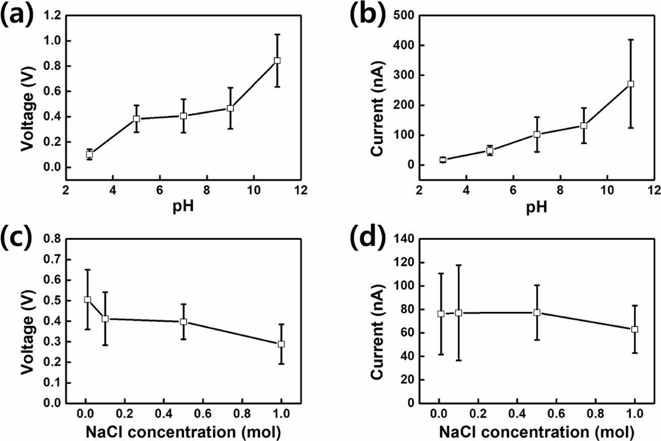 Evaluation of the electricity generation performance of the CS-DEG as function of the solution pH and electrolyte concentration of water droplets. Measured (a) voltage; (b) current as a function of pH. Measured (c) voltage; (d) current as a function of NaCl concentration.