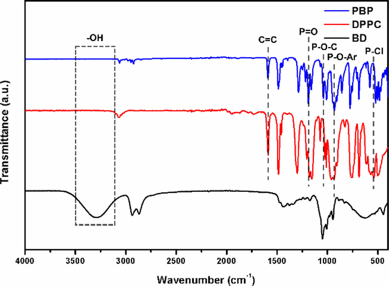 Figure 3 FTIR spectra of BD, DPPC, and PBP. |