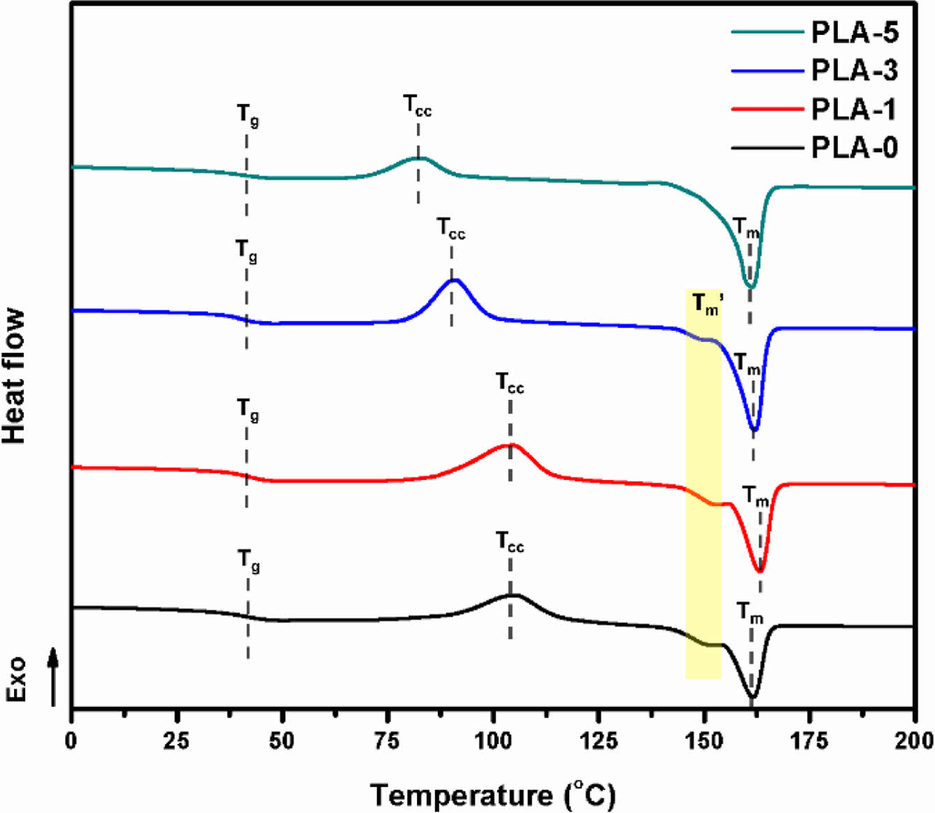 Figure 4 DSC curves from second heating at PLA samples with PBP. |