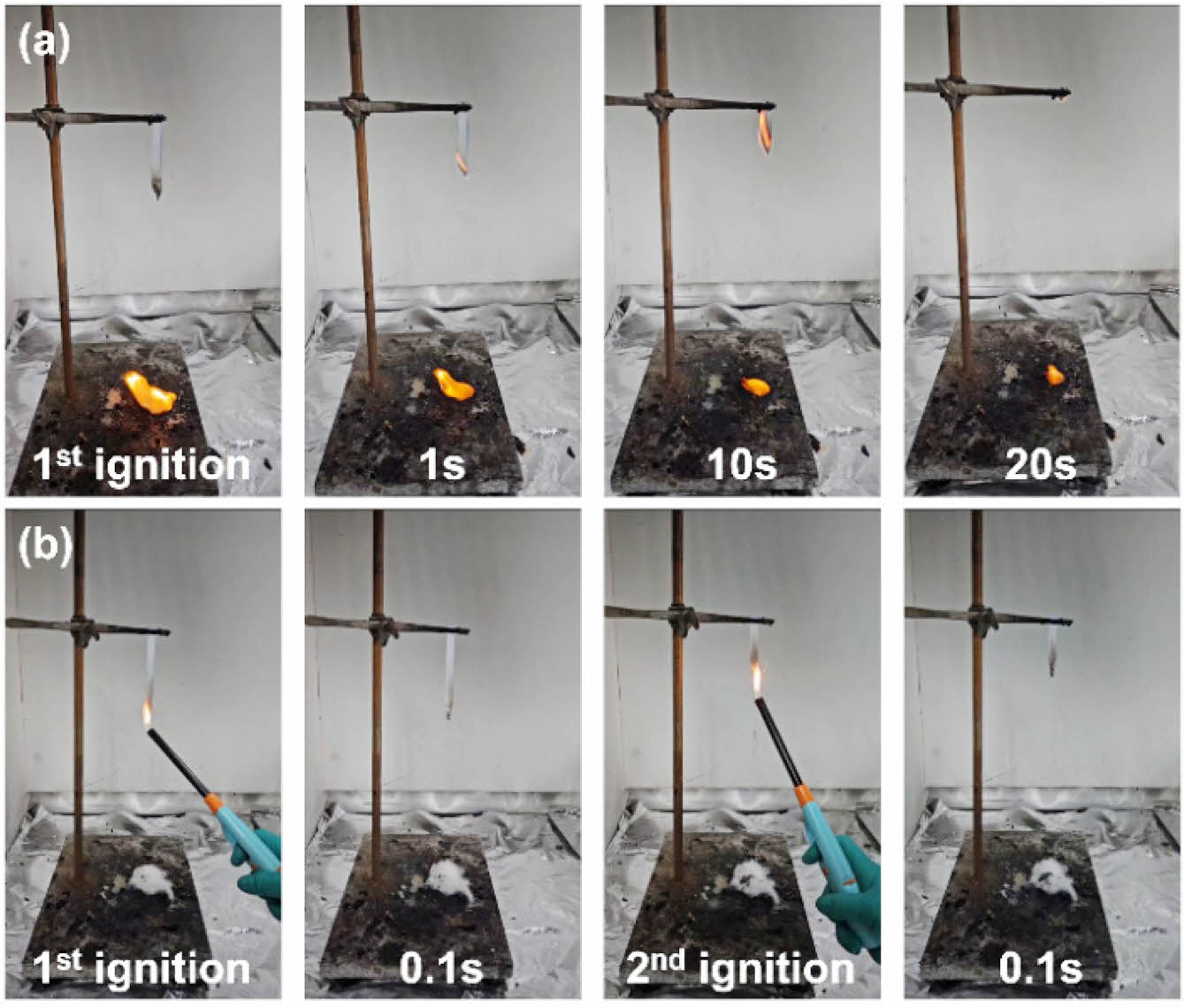 Figure 7 Digital photographs of (a) PLA-0; (b) PLA-3 during UL94 test. |