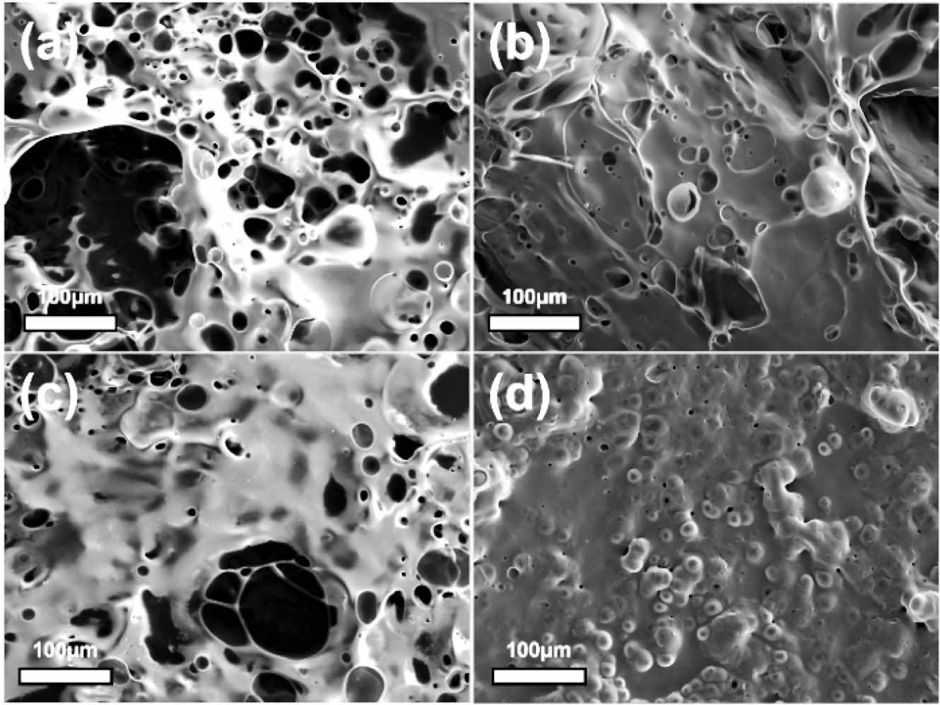 Figure 8 Tabletop scanning electron microscope images of char surface after ignition: (a) PLA-0; (b) PLA-1; (c) PLA-3; (d) PLA-5. |