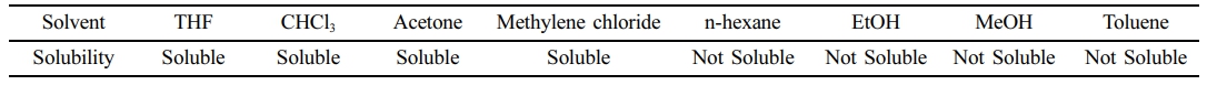 유기인계 난연제의 합성. 본 실험에서 사용한 난연제는 PLA 필름에 첨가형 난연제로 설계하였으며, 합성 방법은 다음에 제시하였다. 500 mL 둥근 바닥 플라스크에 13 g(0.1443 mol)의 BD과 30.7 g(0.3029 mol)의 TEA를 130 mL의 THF 용액에 투입한 후, 30분간 교반하였다. 이 후, 150 mL의 THF 용액에 용해한 77.5 g(0.2885 mol)의 DPPC를 적하 깔때기를 이용하여 둥근 바닥 플라스크 내 기 준비된 BD와 TEA 혼합물에 30분간 천천히 적하하였다. 상온 조건에서 적하 완료 직후, 상온 조건에서 추가로 24시간 동안 반응을 진행하였다. 반응에서 생성되는 HCl은 TEA와 함께 TEA salt를 형성한다. 반응 완료 후, TEA salt는 정성 여과지를 이용하여 여과하고, 여과액을 얻었다. 여과액에 존재하는 반응 용매는 40 ℃ 워터 배스 조건에서 회전농축기를 이용하여 제거하였다. 반응 후, 남아있는 물질은 물과 CHCl3을 이용하여 세 차례 이상 반복하여 추출해주었으며, 추가로 100 mL의 MeOH을 이용하여 3회 세척하였다. 이 후, MgSO4를 사용하여 유기 용매 층의 수분을 제거하고, 50 ℃ 워터 배스 조건에서 회전농축기를 사용하여 유기 용매를 제거한 후 최종 생성물을 얻었다. 이를 통해 초기 DPPC의 무게 대비 45.8%의 수율로 흰색 고형의 물질을 얻었다. 이를 PBP라 명명하였으며, 이의 화학 구조를 Scheme 1에 나타내었다. 추가로 PBP의 유기용매에 대한 용해도 평가를 통해 PLA외 다양한 고분자의 적용 가능성을 확인하였다(Table 1).