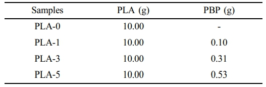 PLA 필름의 제조. 본 연구에서 사용된 PLA 필름은 용액주조 방법을 이용하여 제조되었으며 PLA 필름의 명명은 Table 2에 나타내었다. 제조 과정은 다음과 같다. 먼저 PLA 4032D의 수분을 제거해 주기위해 50 ℃에서 24시간동안 건조시킨 후, 삼각 플라스크를 이용하여 PLA 4032D 10 g을 CHCl3 100 mL에 용해시킨다. 이 후 PBP를 정확한 질량비로 삼각 플라스크에 투입 후 24시간동안 교반시킨다. 교반이 완료된 후, 유리 몰드에 혼합물을 투입하여 상온에서 일주일동안 잔류 용매를 제거하였다.