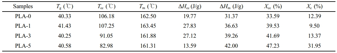 PBP와 PLA 필름의 열적 특성. PLA필름의 온도에 따른 거동과 결정성을 확인하기 위해 DSC분석을 진행하였다. 결정화온도는 냉결정화 온도(Tcc)를 측정하였으며, 필름의 전체 결정화도(Xcc)와 냉각과정에서 형성되는 결정화도(Xc)는 엔탈피 값을 통해 계산되었다.29 계산식은 식 (1)에 나타내었다. Figure 4와 Table 3는 DSC 승온 결과를 보여준다.
