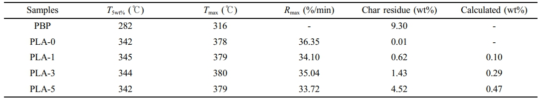 이를 확인하기 위해 TGA으로부터 700 ℃에서 PLA와 PBP의 char의 양과 함량을 이용하여 계산한 이론적인 char의 양과 실제 얻은 char의 양을 비교하였다. 이론적인 char의 양 계산식은 식 (2)에 나타내었다.33