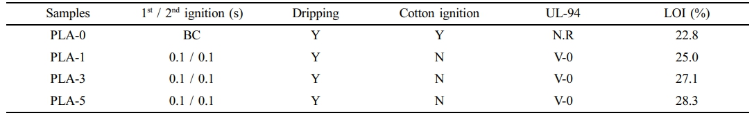 식 (2)에서의 0.01의 값은 700 ℃에서 구한 PLA char의 양이며, 9.30의 값은 700 ℃에서 구한 PBP char의 양이다. 모든 PLA 필름에서 실제로 얻은 char의 양은 이론적으로 구한 char의 양보다 많은 것을 확인할 수 있었다. 예를 들어, PLA-3에서 이론적으로 계산한 char의 양은 0.29 wt%였지만, 실제로 얻은 char의 양은 1.43 wt%로 이론적인 값보다 많은 양의 char를 얻을 수 있었다. PBP는 P-O 결합이 포함되어 있어 분해과정 중 인산이나 폴리인산이 형성될 수 있다.34,35 이렇게 형성된 인산과 폴리인산은 char 형성을 촉진시킬 수 있는 물질로, 형성된 많은 양의 char는 대기중의 산소나 열을 차단하는 보호막을 형성하여 난연 효과를 부여할 수 있다.