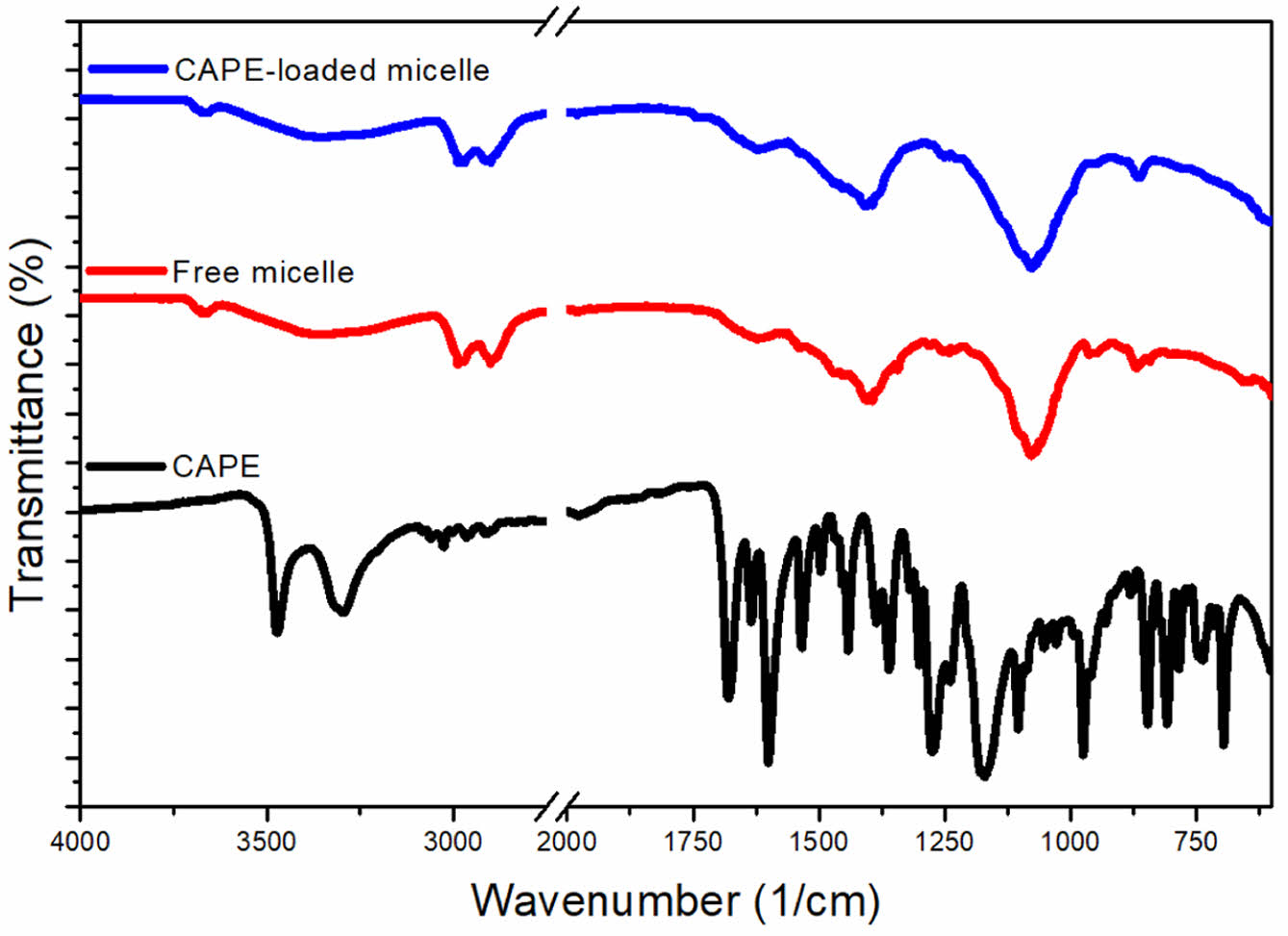 Figure 3 FTIR spectra of CAPE, free PAM-PEG micelle and CAPEloaded PAM-PEG micelle. |
