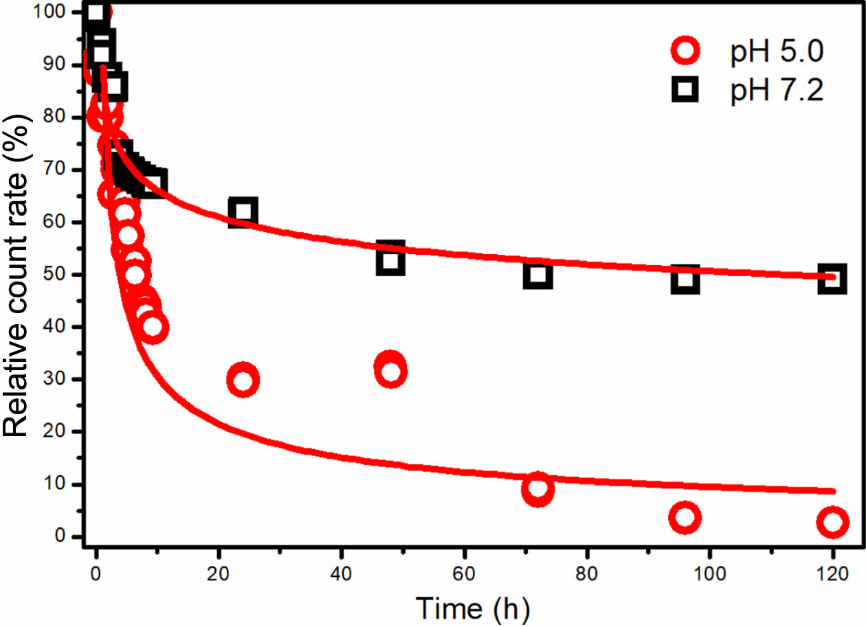 Figure 5 Relative count rate of CAPE-loaded PAM-PEG copolymer micelle at pH 5.0 and 7.2 depending on tine. |