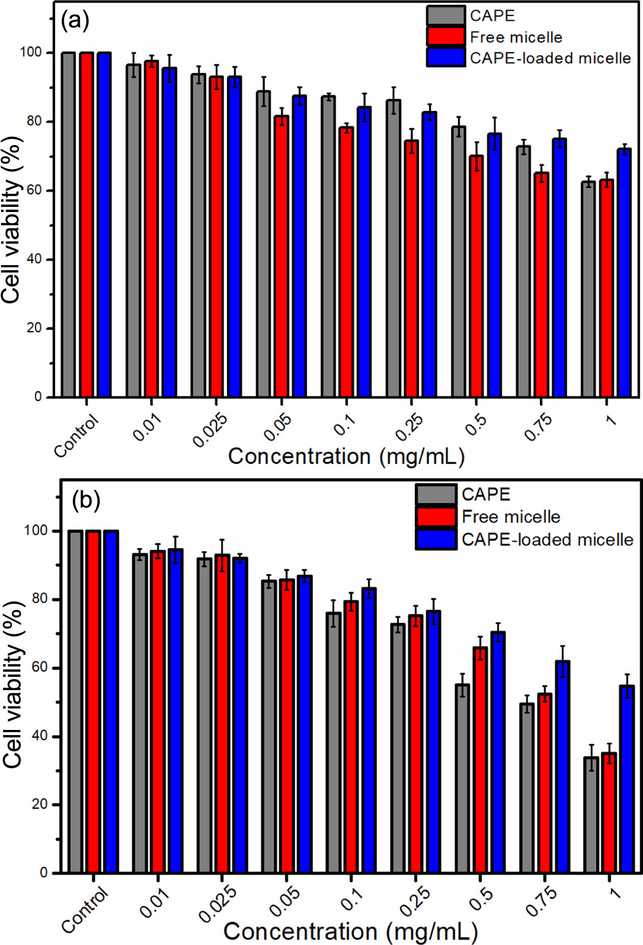 Figure 6 Viability of HDF cells against CAPE, free micelle and CAPE-loaded micelle after (a) 24; (b) 48 hours of incubation. |