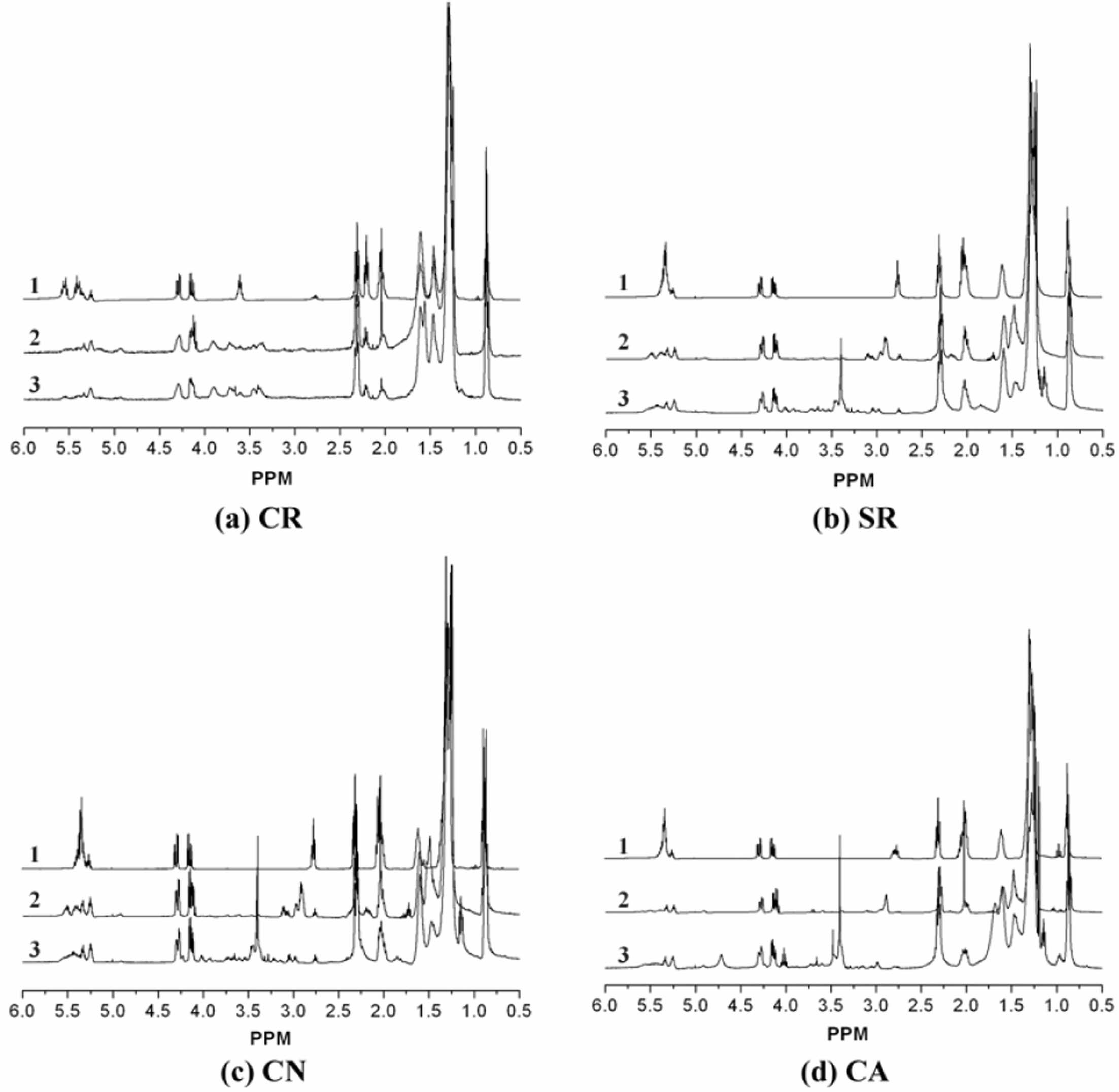 1H NMR spectra of the (a) CR; (b) SR; (c) CN; (d) CA (1: pure, 2: after epoxidation, and 3: after methoxylation).