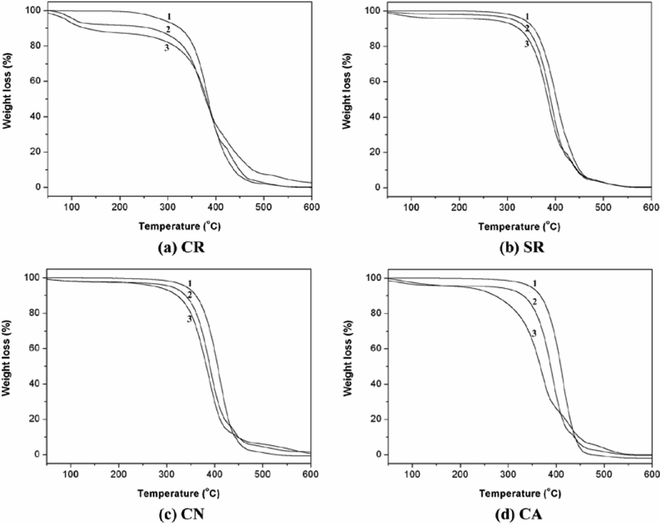 TGA traces of the (a) CR; (b) SR; (c) CN; (d) CA (1: pure, 2: after epoxidation, and 3: after methoxylation).