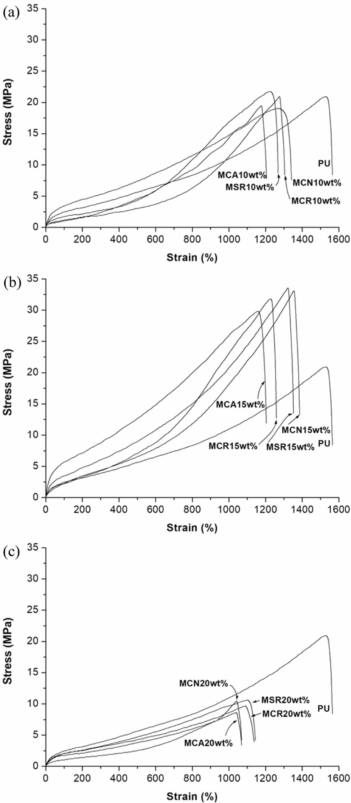 Stress–strain curves of the prepared PU with methoxylated oil content of (a) 10; (b) 15; (c) 20 wt%.