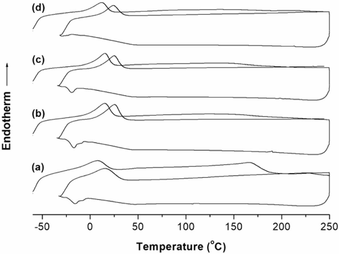 DSC thermograms of the (a) PU; (b) PU/MSR10 wt%; (c) PU/MSR15 wt%; (d) PU/MSR20 wt% samples.