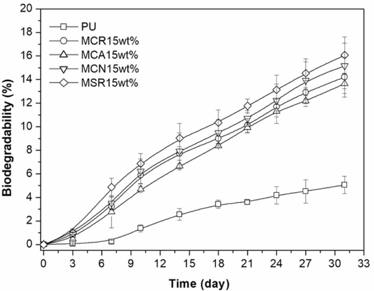After incubation for 31 days, the biodegradability of PU was very low, reaching approximately 5%. Additionally, it can be seen that there is a lag of 7 days during which biodegradation hardly occurs. However, the chain-extended PU with 15 wt% of MSR, MCN, MCR, and MCA showed improved biodegradation rates than pure PU, with no time delay for biodegradation. This is consistent with the decreasing order of TS of chain-extended PU and biodegradability of methoxylated oil.