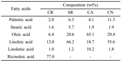 Materials. CN, SR, and CA oils were manufactured by Haepyo, Korea and purchased from grocery stores. CR was extracted from the seeds of the Castor plant. Fluoboric acid, poly(tetramethylene ether) glycol (PTMG, Mw » 2000), 1,4-phenylene diisocyanate (PDI), and tin(II) 2-ethyl-hexanoate (TEH) were supplied by Sigma-Aldrich. Table 1 summarizes the percent fatty acid composition by weight of four vegetable oils.