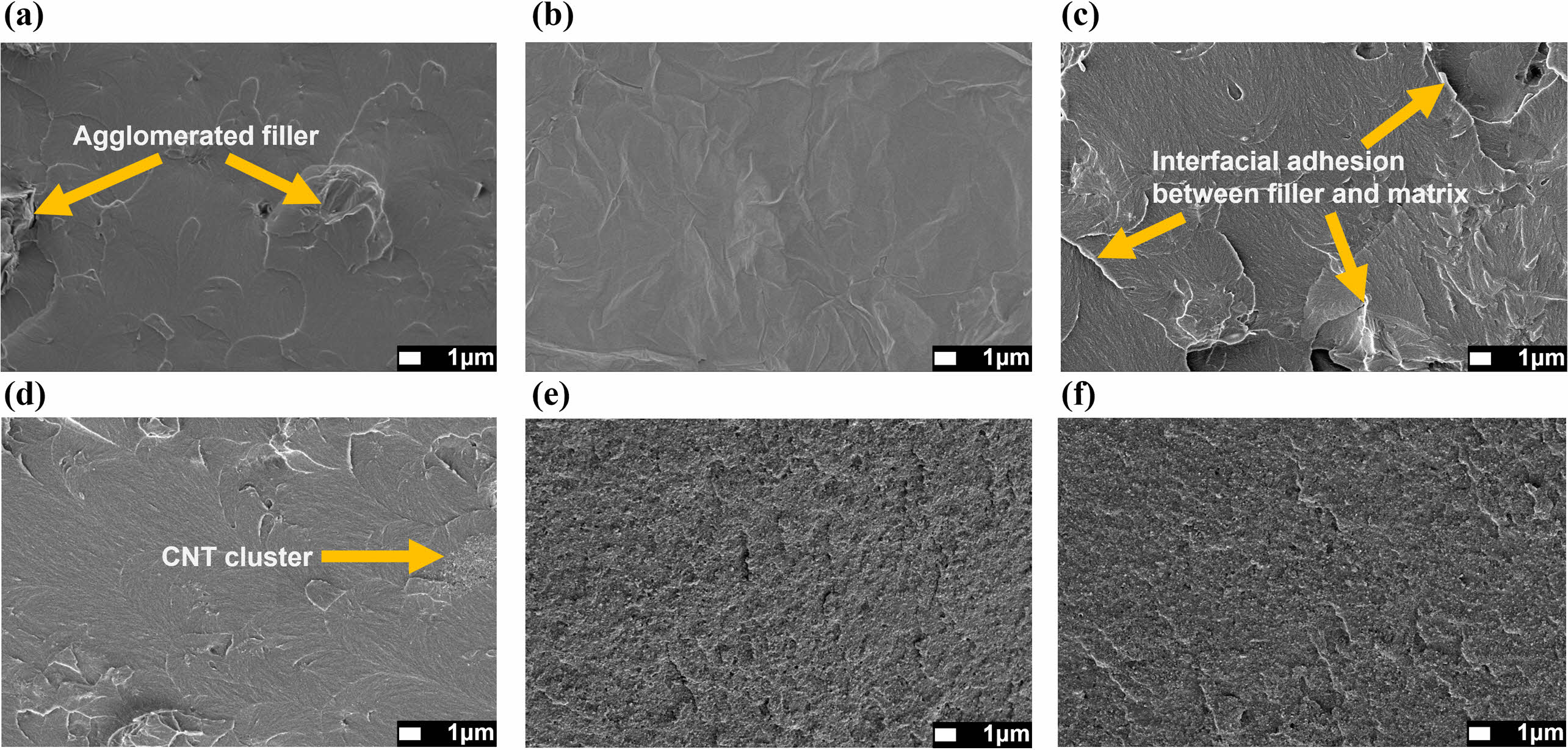 CNT/glycidyl-GO-POSS is shown in Figure 3(d)-(f). The CNTs are densely clustered within the matrix, forming clusters with an approximate diameter of 2.5 mm, as indicated by the arrows in Figure 3(d). As the ratio of CNTs increases, a greater number of clusters are formed in the entire area, and the cross-sectional surface becomes rougher (Figure 3(e) and 3(f)). This indicates that the dispersion of CNTs at ratios greater than 3 wt% is not optimized, resulting in agglomeration among the CNTs.