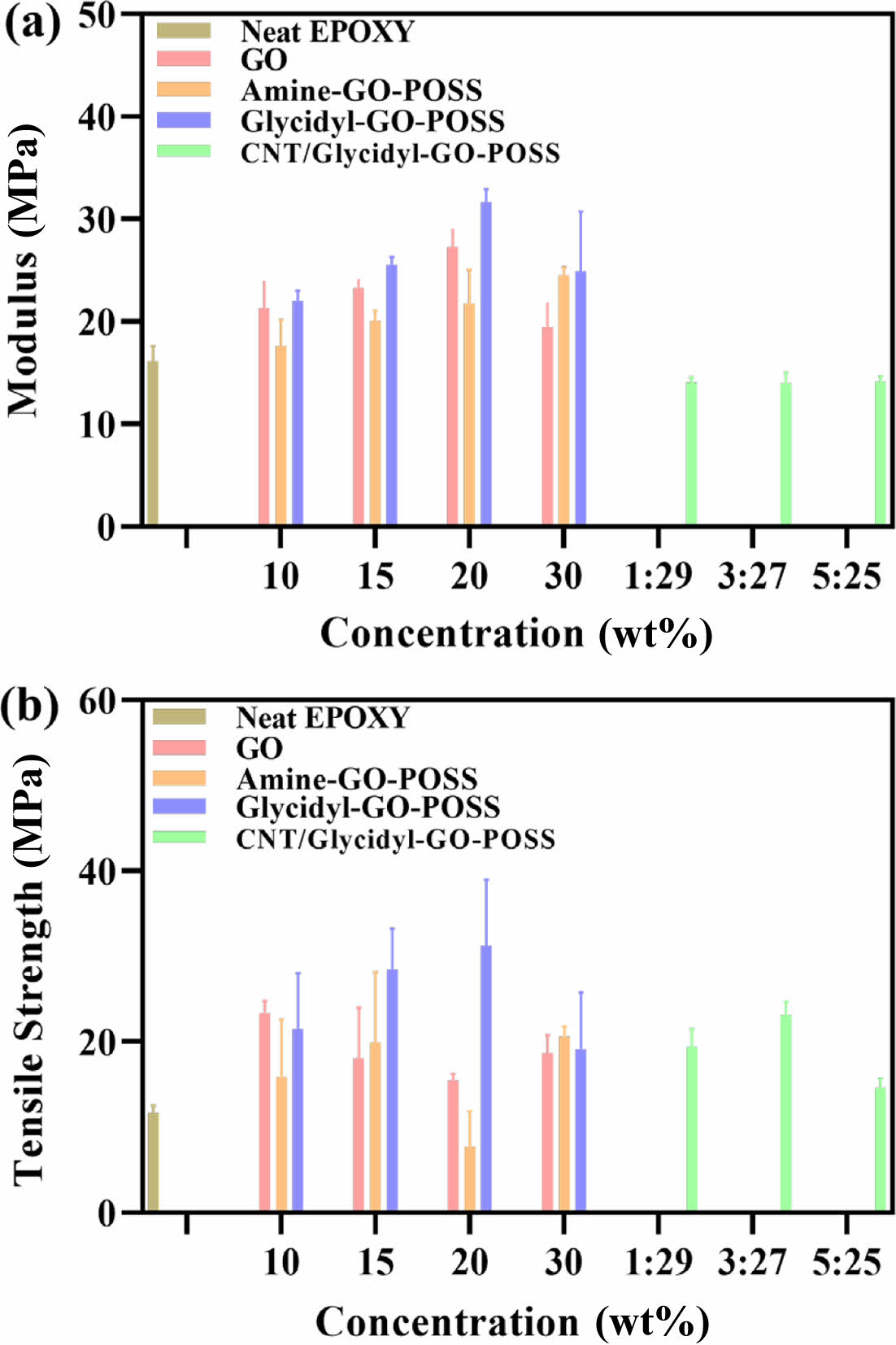 Figure 4 (a) Young’s Modulus; (b) Tensile Strength of epoxy-based nanocomposites. |