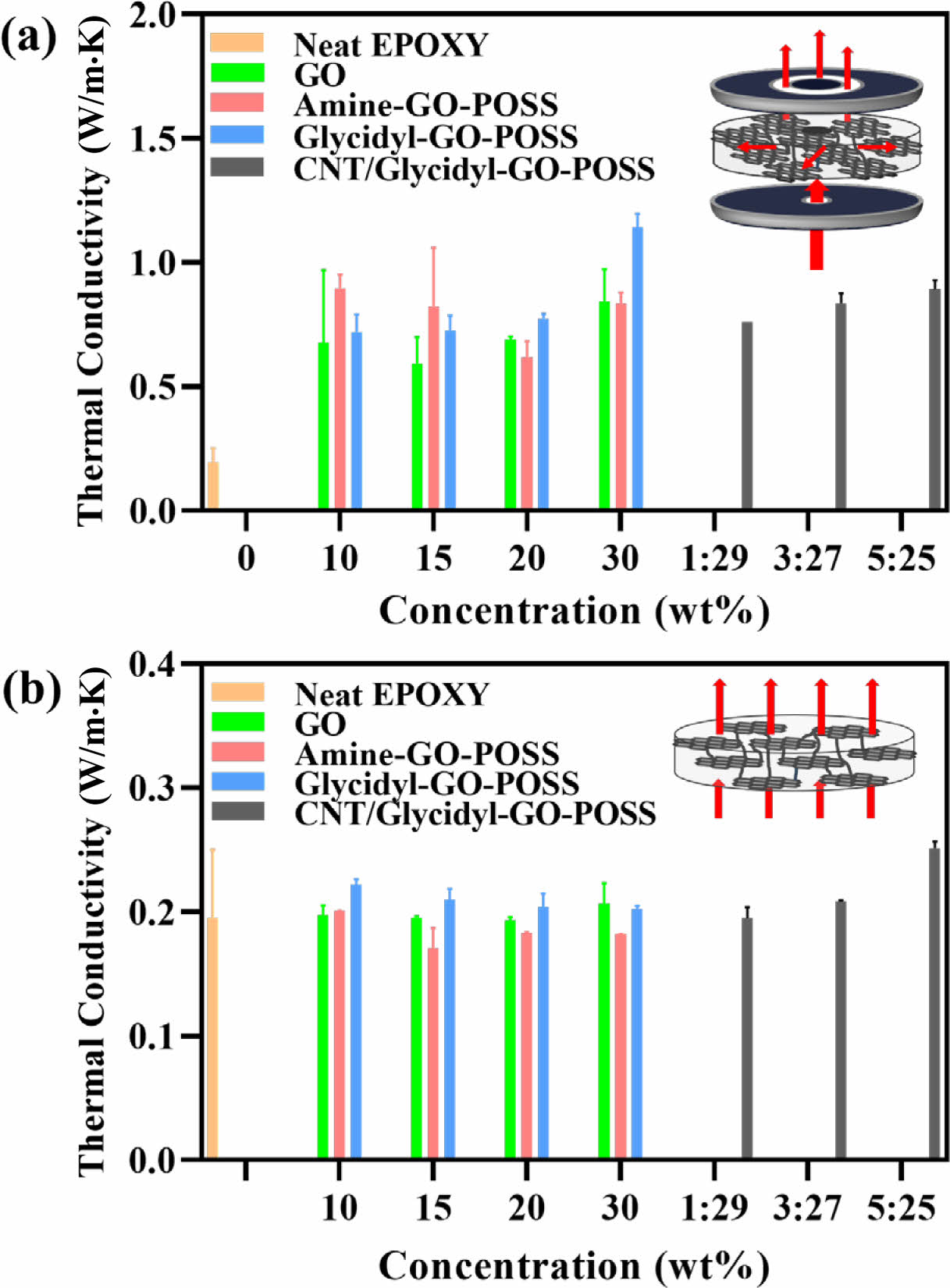 The thermal conductivity in the horizontal direction is shown in Figure 5(a). The horizontal thermal conductive samples were fabricated to be 25.4 mm in diameter and 0.5 mm in thickness. The thermal conductivity of the entire epoxy composite in the in-plane direction is higher than that of neat epoxy. The GO 30 wt% composite had a thermal conductivity of 0.843 W/mK, which was 432.3% higher than that of neat epoxy. The glycidyl-GO-POSS (30 wt%) rose by 585.6%, reaching a maximum value of 1.142 W/mK. This is a 135.4% increase compared to the GO 30 wt% composite, which is due to the strong interfacial adhesion between glycidyl-GO-POSS and epoxy. The CNT/glycidyl-GO-POSS (30 wt%, 5:25) produced no significant effects on horizontal thermal conductivity; however, it exhibited the most substantial increase in vertical thermal conductivity, as shown in Figure 5(b). The vertical thermal conductive samples were prepared with a diameter of 12.7 mm and a thickness of 2 mm. The vertical thermal conductivity experienced a slight enhancement across all epoxy composites when compared to the neat epoxy. Nevertheless, the notable increase observed in the CNT/glycidyl-GO-POSS (30 wt%, 5:25) can be attributed to the synergistic effect of the bridging