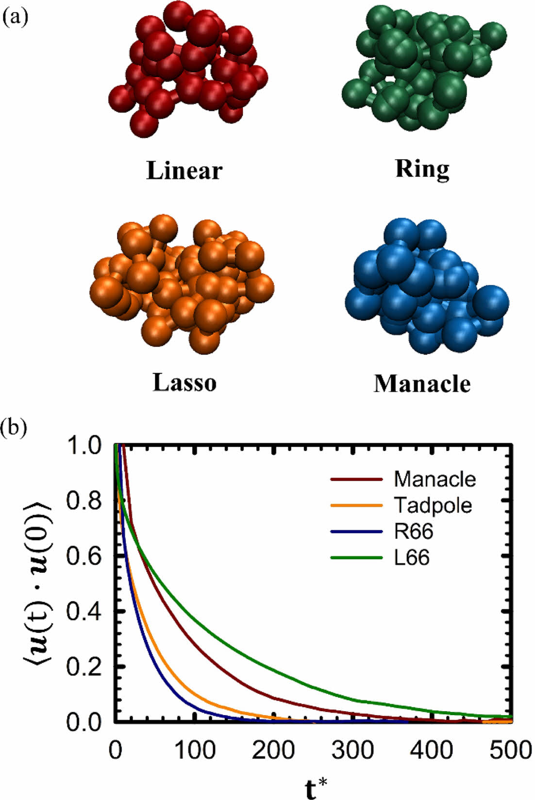 고분자 체인의 동적 특성에 큰 영향을 미치는 가장 긴 완화 시간은 분자량의 제곱에 비례하여 증가하는 것으로 알려져 있다. 하지만, 동일한 분자량을 가진 네 가지 고분자 시스템들은 고리형 고분자(R66) < 올가미형 고분자 < 수갑형 고분자 < 선형 고분자(L66) 순으로 완화 시간이 증가하였다.